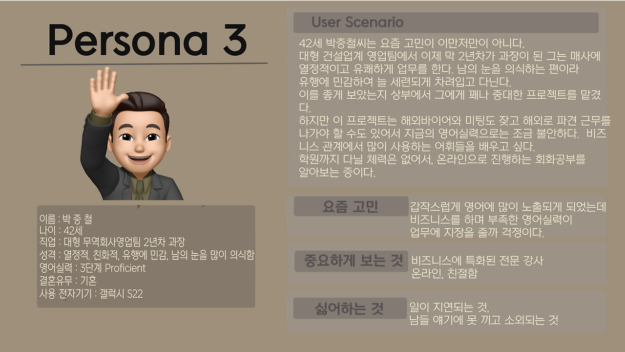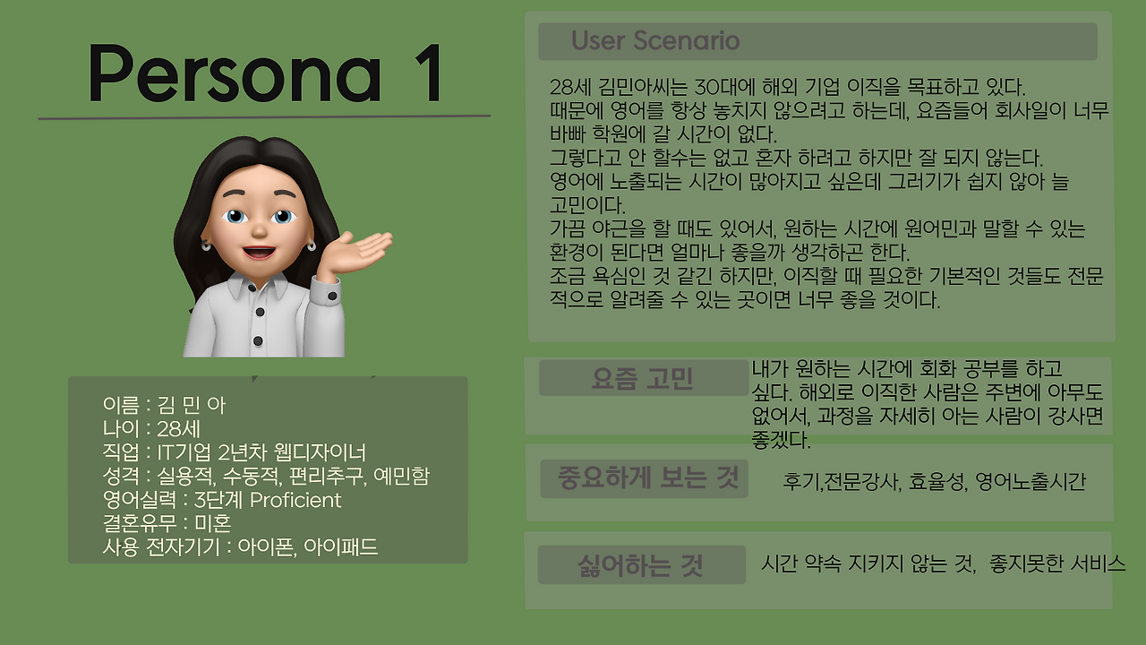 이렇게 하나의 프로덕트인 링글사이트를 보며 가장 많이 사용하고 메리트를 느낄 것 같은 집단들을 정리했을 때 나오는 퍼소나는 다음과 같았다.