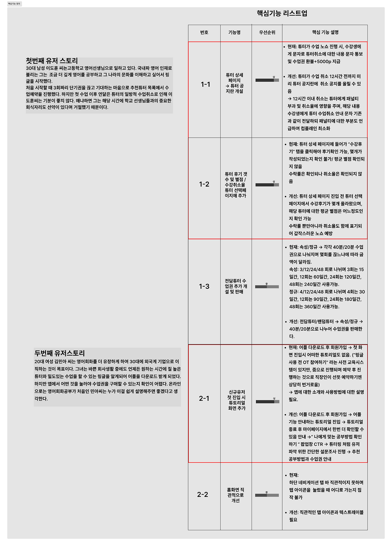 그리고 매겼던 우선순위 중에서도 가장 핵심기능이 무엇인지 한번 더 우선순위를 매겨보았다.