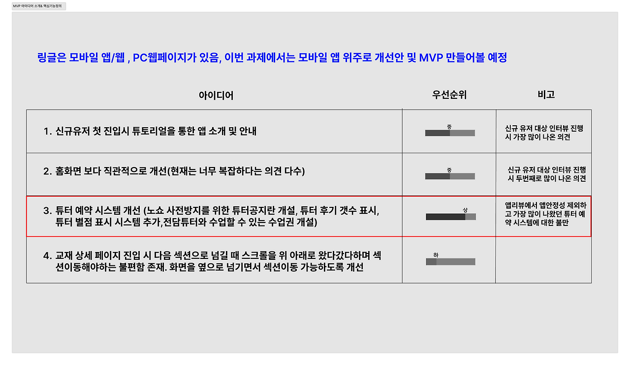 다시 링글로 돌아가자면, 내가 이 어플을 보며 개선/추가 하고 싶은 것을 적어보고 우선순위를 매겨보았다.