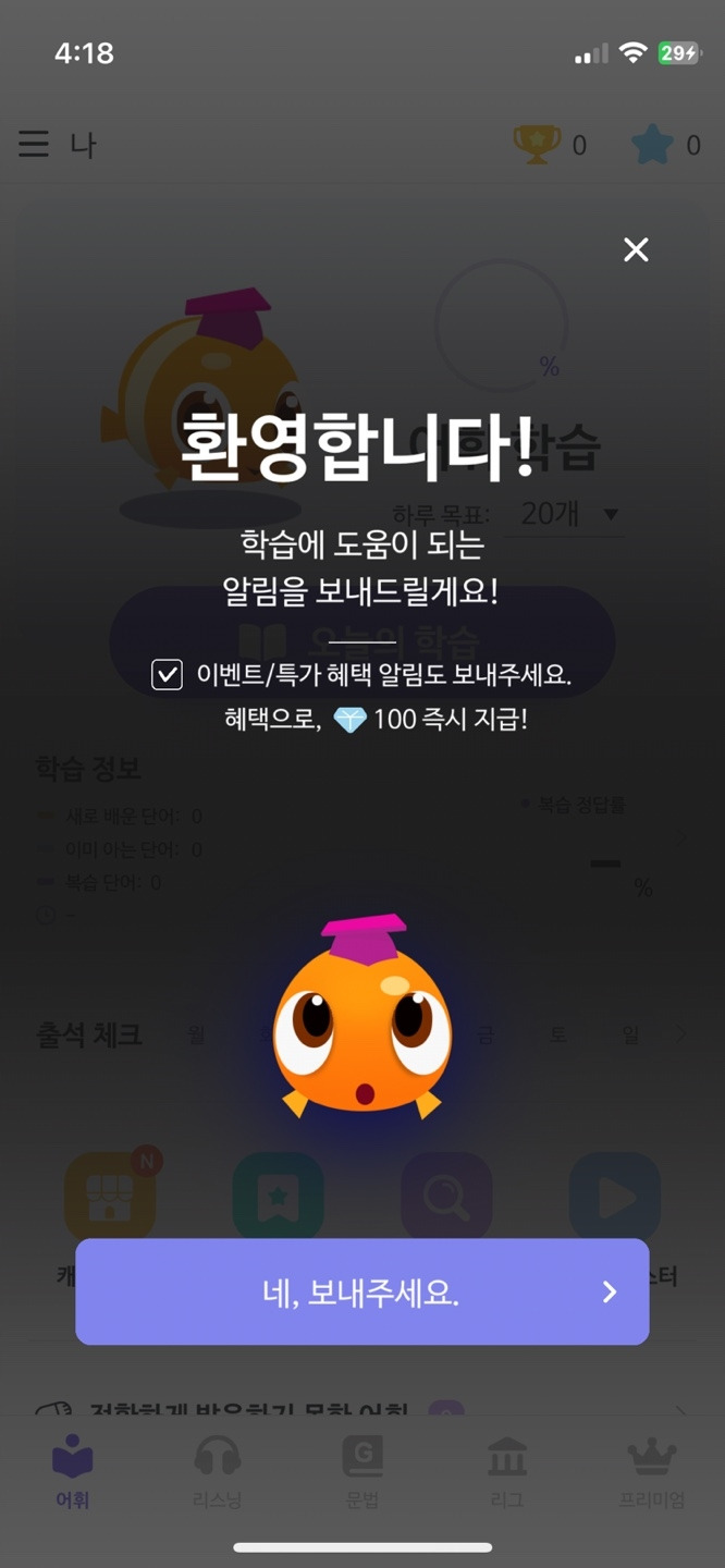 해지를 하는 사람도 있겠지만 이미 이 유저는 캐릭터가 너무 귀엽다. 거기에다가 빈칸에 채워넣는 영어단어를 매일 다 맞는것도 아닌지라 자존심도 조금 상한다.