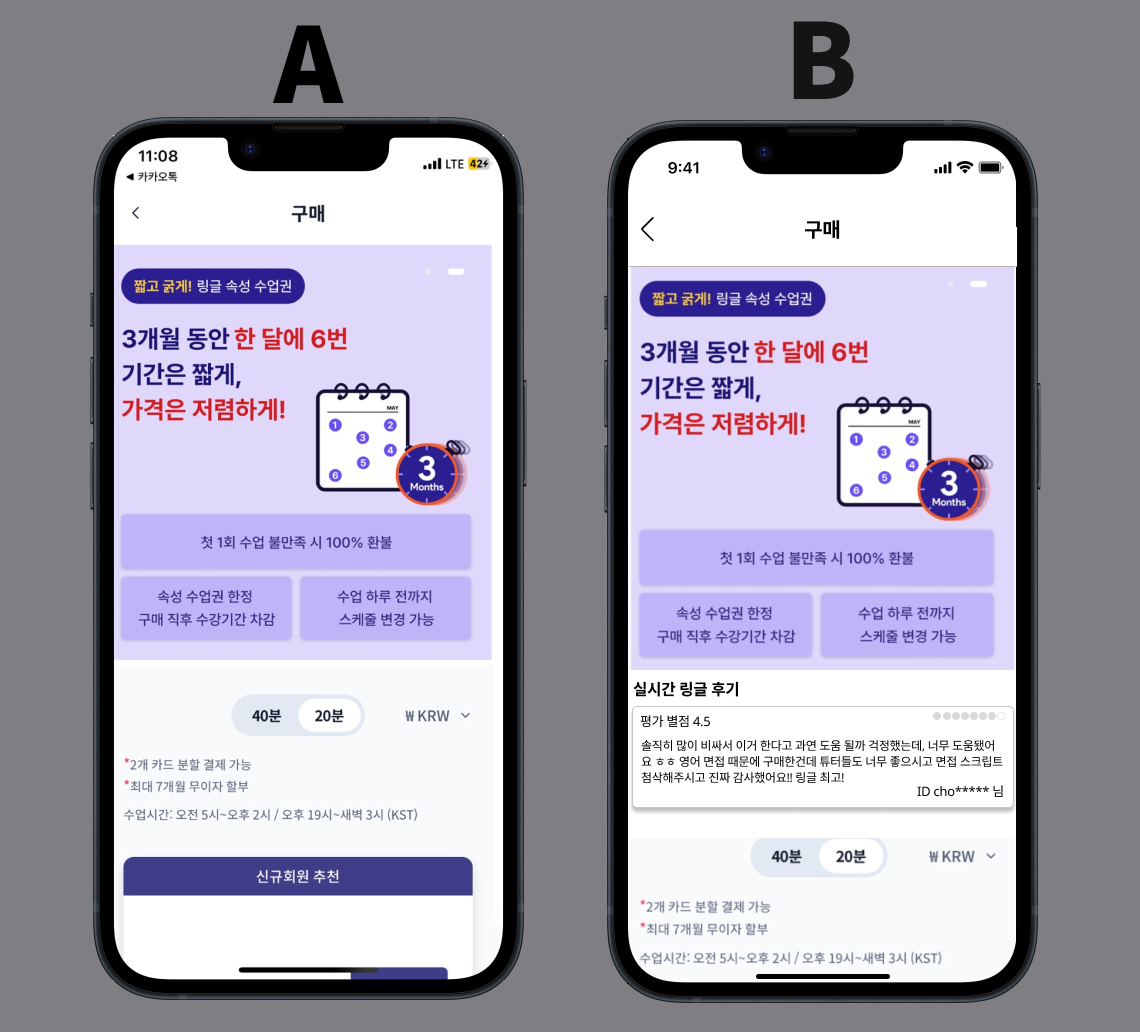 A안은 기존의 구매 페이지, B안은 이용후기 배너가 들어간 구매 페이지이다. 이용후기의 경우 광고 배너처럼 슬라이드로 실시간 후기를 확인할 수 있다.