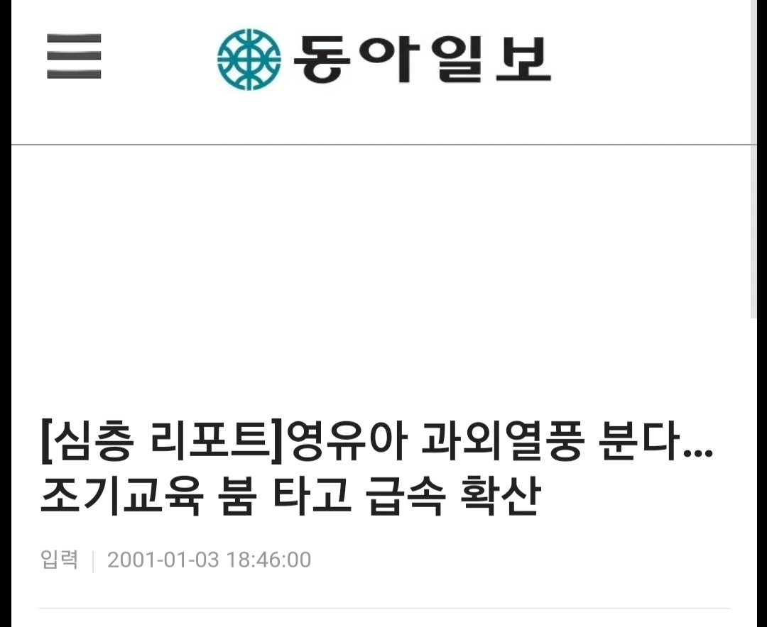 지인 중에는 아이가 6살이 되던 해에 놀이식 영어 유치원에 보냈다가, 채 3개월을 못 채우고 이전에 다니던 놀이학교로 옮겼다. 이유를 물으니 놀이식 영어 유치원이라 해서 보냈던 곳이 앞서 말했듯 실제로는 놀이식이 아니었던 것이다. ‘놀이식인 척했던’ 유치원에서는 매일같이 시험을 봤고, 아이는 매일 같이 틀렸다. 심지어는 알파벳도 잘 모르는 아이에게 5 문장의 작문을 해오라고 숙제가 나왔다. 도저히 상식적으로 이해가 가지 않았던 엄마는 유치원에 전화를 했고, 유치원에서 이렇게 말했다. “어머니, 아이가 과외를 안 해서 따라갈 수 없는 거예요. 과외를 시키세요. 영어 유치원에 다니며 과외를 안 하는 아이는 거의 없어요.”