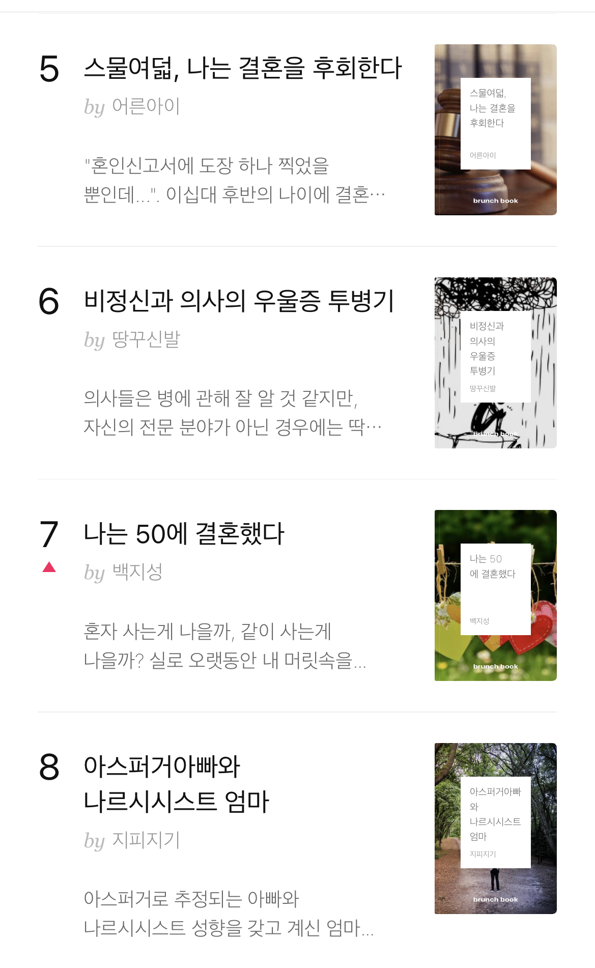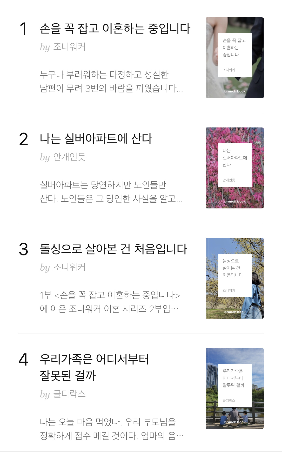 나는 요즘 브런치에 매일 들어올 때마다 보이는 ‘요즘 뜨는 브런치 북’을 살펴본다.(잠시지만 내 책도 9위 즈음에 머물었던 적이 있기도 하다.) 몇 주째 상위권을 자리 잡은 책들은, 다들 제목부터 슬프다.