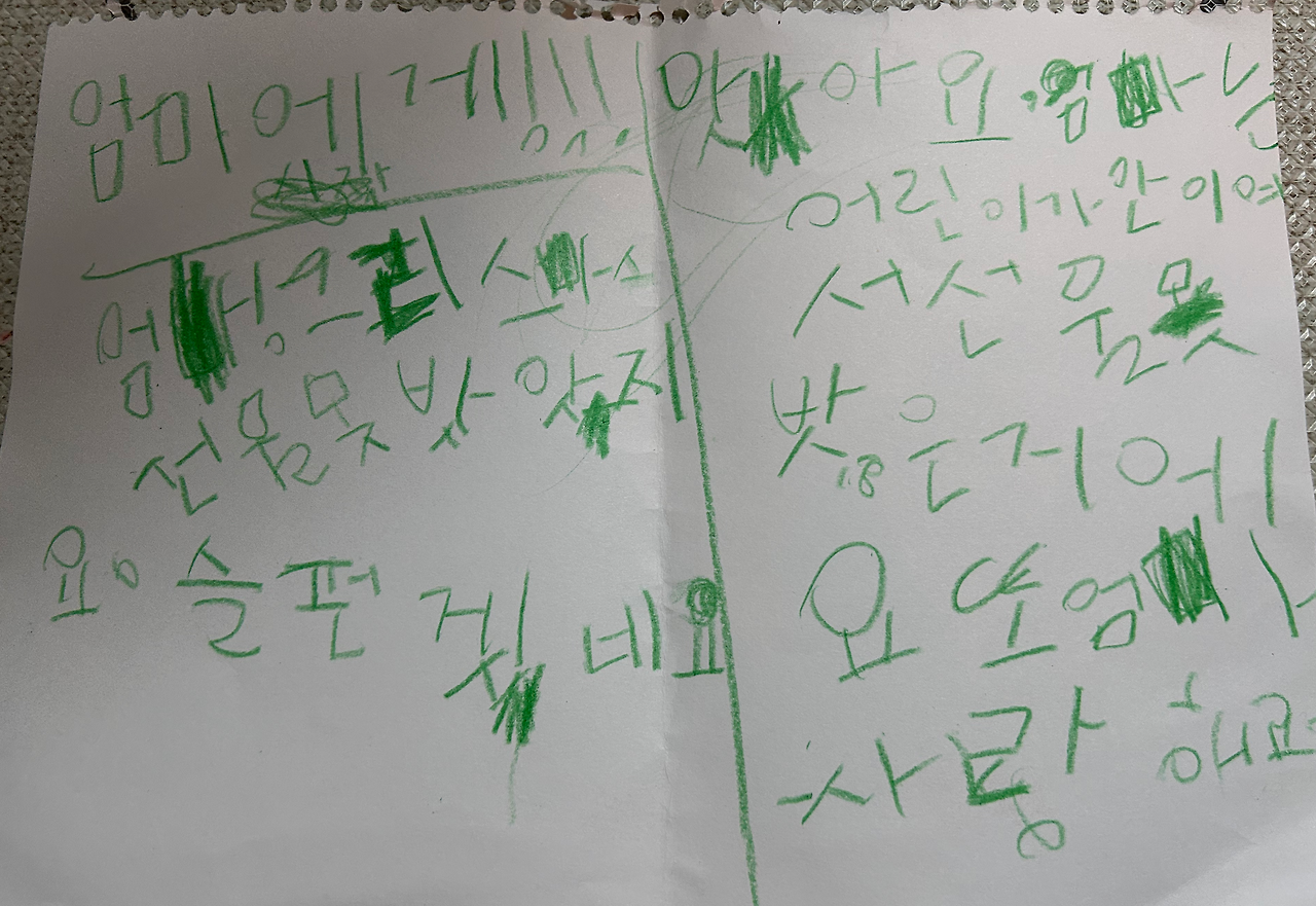 아이들은 조금 곤란한 표정을 짓더니 이내 못 들은 척한다. 십분 정도 지났을까, 첫째가 편지라며 큰 종이를 건넨다.