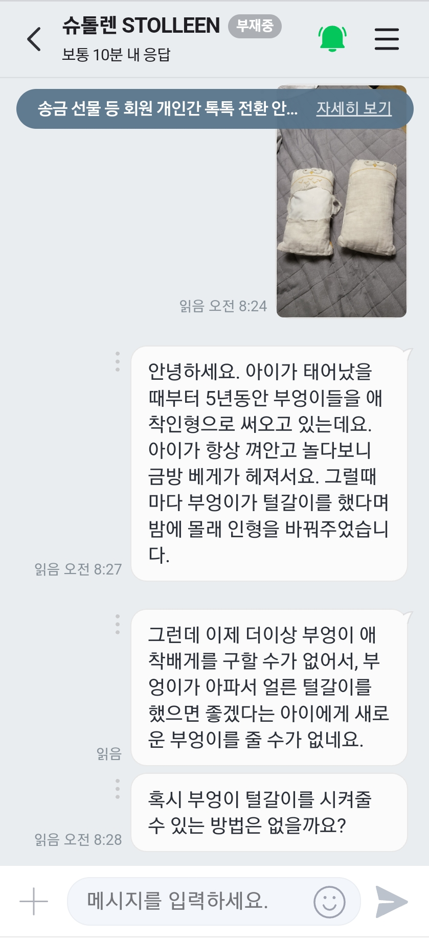 그러다 하루는 남편이 세상 진지한 표정으로 무언가를 적고 있길래 다가가보니, 아이의 애착배게를 만드는 회사에 거의 읍소를 하고 있었다. 나는 남편의 진심이 가득 담기다 못해 넘치는 글을 보고는, 괜스레 눈물이 났다.