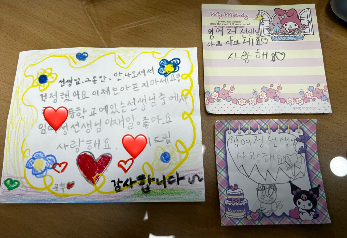 앞문을 열고는 칠판을 보는데, 부끄러울 새도 없이 눈물이 터져 나온다. 우리 반에서 한글이 제일 부족한 아이 둘이 있다. 방과 후 시간을 활용해 함께 공부하던 아이들이었다. ㄱㄴㄷ도 제대로 구분 못하던 그 아이들이, 나에게 무려 편지를 쓰고 갔다. 꾹꾹 눌러쓴 글씨 하나하나에 넘치도록 큰 사랑이 담겨 있다. 내게 배운 한글로, 나를 위로한다.