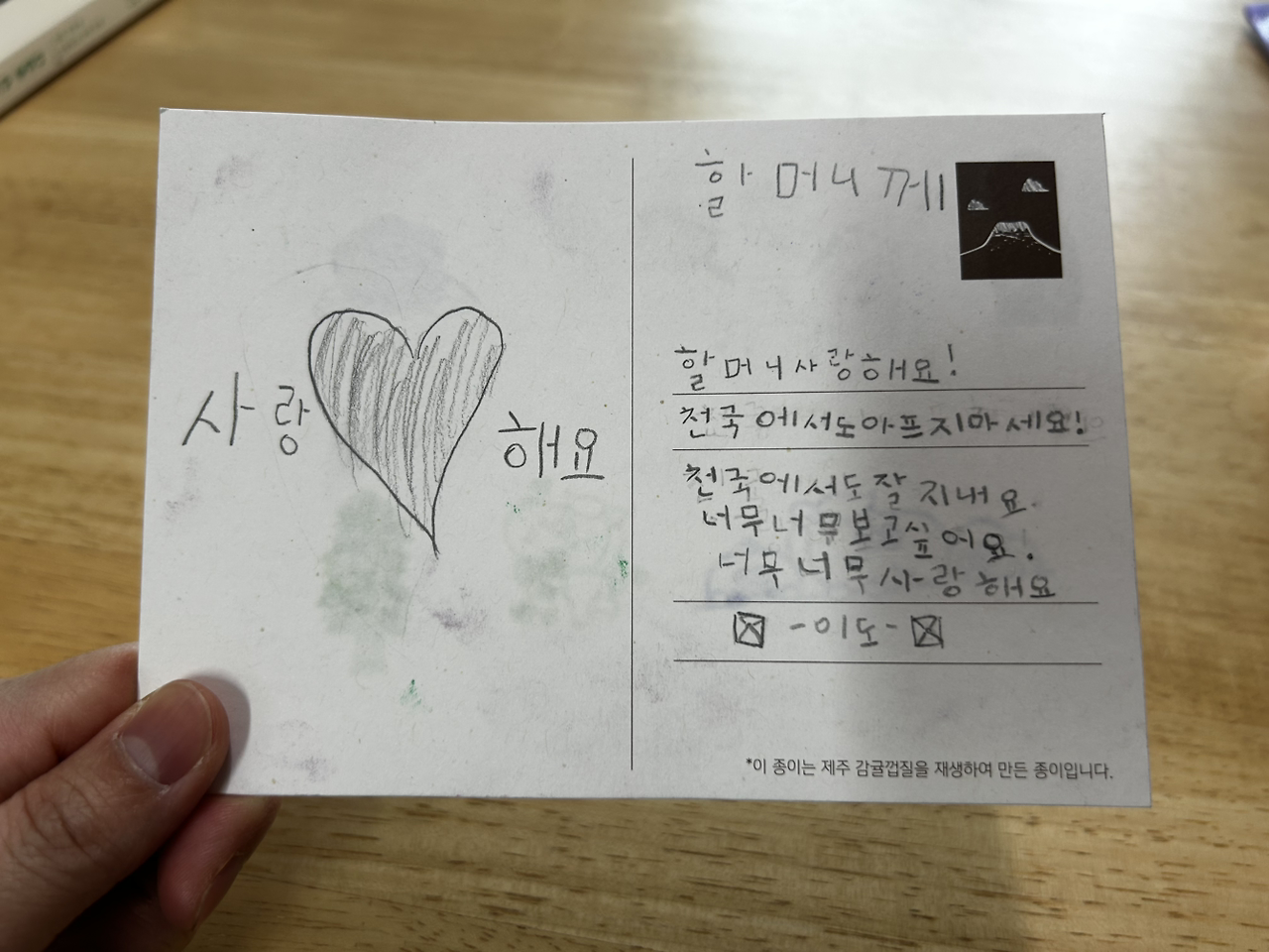 이제 막 한글을 뗀 5살 둘째의 편지를 읽어본다. 정말 할머니가 읽을 수 있는 것처럼 어찌나 정성스러운 글씨로 여러 번 고쳐 썼는지, 편지지는 지웠다 쓴 흔적으로 시커멌다. 그곳에서는 더 이상 아프지 말라는 아이의 말, 너무너무 보고 싶다는 아이의 말이, 지금 나의 마음과 너무 같아서 고맙다.