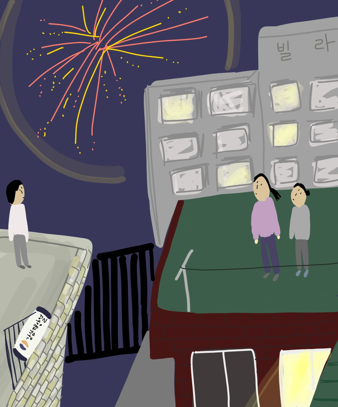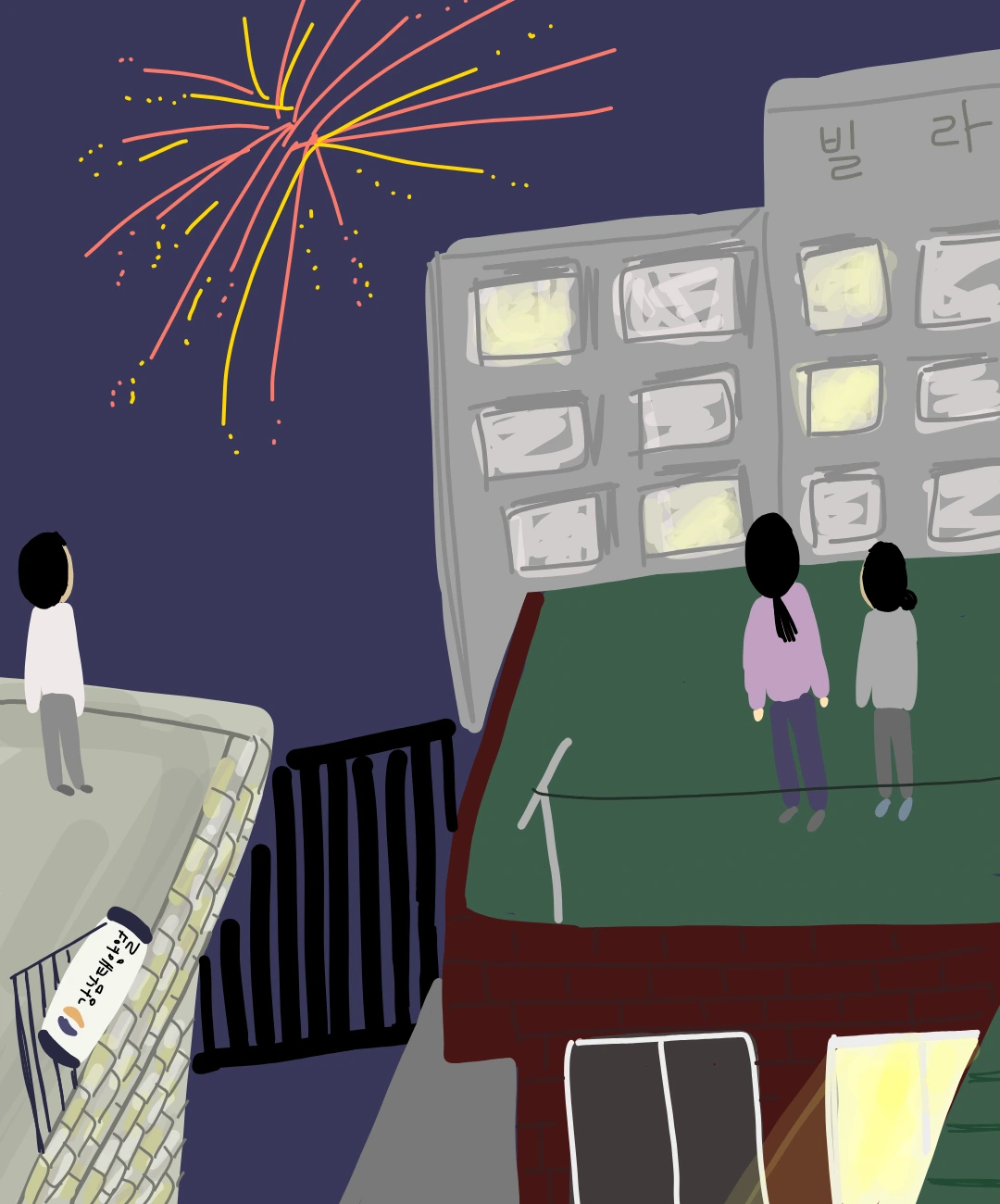 불꽃을 보는데 앞집 남학생도 자기 집 옥상에 올라와