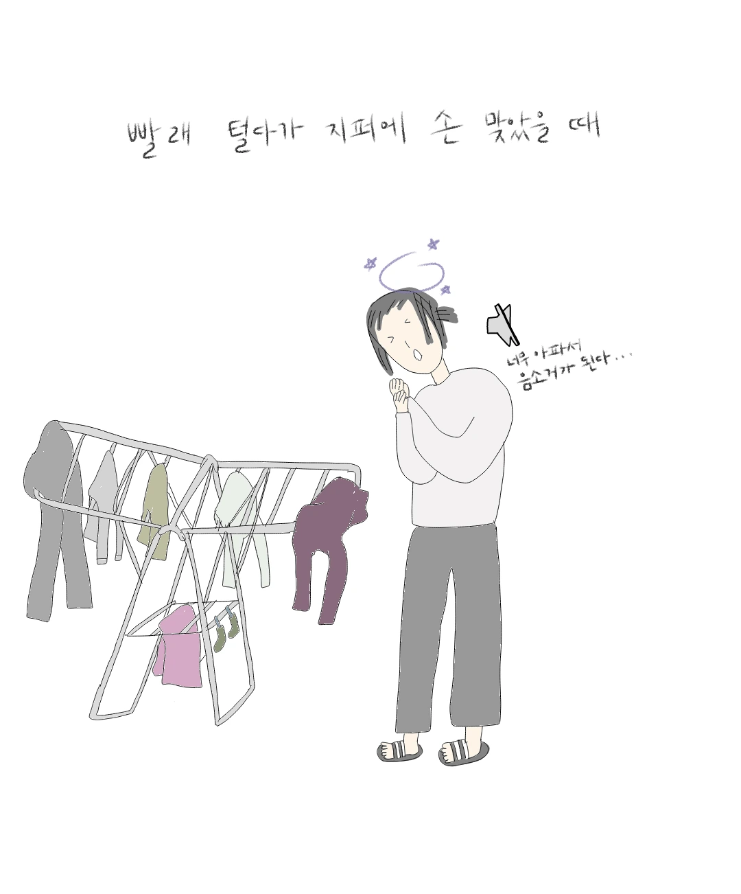 빨래를 털다가 옷 지퍼에 손등을 맞았다.