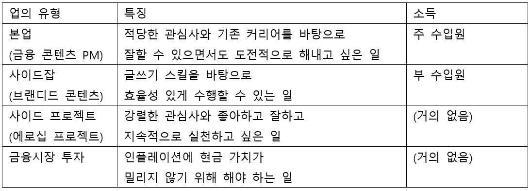 반면 그 외의 모든 일은 ‘수익 창출’이 목표다. 사업소득으로서의 글쓰기를 보자. 이는 내게 부수익의 영역으로서 단기 현금흐름을 키워주는, 단기 매매의 영역이다. 근로소득은 이보다는 중장기적 영역이다. 물론 현재와 같은 PM이든, 에디터업으로 돌아간들 커리어적 목표는 중요하다. 그건 ‘어떠한 리더/구성원이 되겠다’는 조직 내 상일 수도, ‘맡은 프로젝트에서 무엇 하나 확실한 인사이트를 내고 말겠다’는 다짐일 수 있다. 그러나 이 모든 것은 결국 원하는 연봉이라는 목표가와 이어져야 한다.