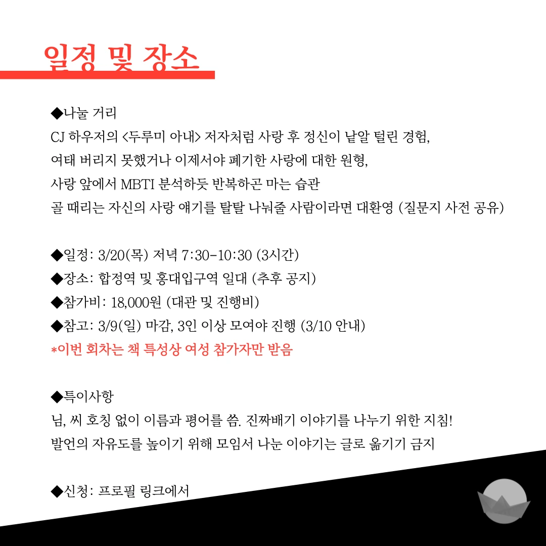 신청은 아래 링크에서 (인스타그램에서도 가능해요!) *이번 모임은 여성만 가능