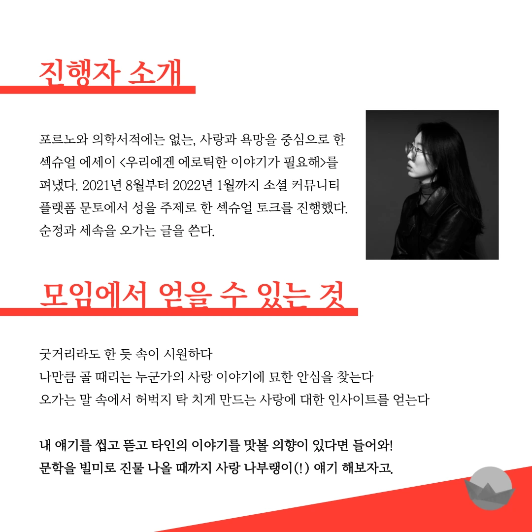 사랑 한 번 했다 하면 속 터지는 사람 들어와. 남탓 내탓 다 하면서 지난 사랑의 궤적들을 개탄해보자. 있는 그대로의 나 자신을 받아들이지 못해 괴로웠던 경험, 상대의 비뚤어진 면모까지 수용해야 진짜 사랑이라고 믿었었던 나날, 결국 부단한 실패 끝에 무엇이 대체 사랑인지 알 수 없게 된 지경에 도달해 본 이들이라면 너무 환영해. 눈물 콧물 날 때까지 지치도록 사랑 얘기해보자...!