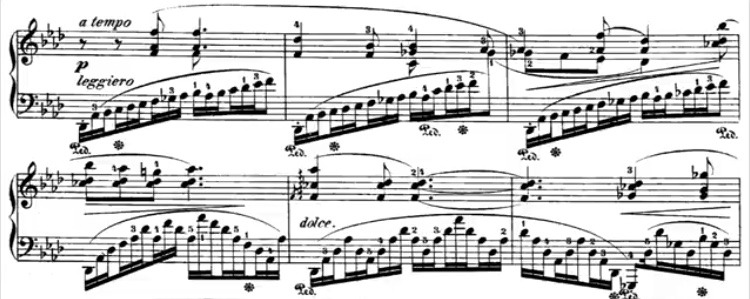 언뜻 평범해 보이는 단선율이다. 그러나 단선적으로 누르는 건반으로는 감흥을 끌어낼 수 없다. 터치 전부를 챙기지는 못했지만, 이 소절의 터치는 유독 신경 쓰였다. 그가 표현한 것처럼 여물게 익은 소리가 탄력 있게 날아오르도록 노력을 기울였다. 앞서 건조하게 뚝뚝 끊기는 소리를 보완하려고 페달을 더했지만, 레 플랫(d flat)에서 다음 옥타브 파(f)까지 분별없이 섞이는 소리도 바람직하진 않았다. 곧, 페달을 뗐다.