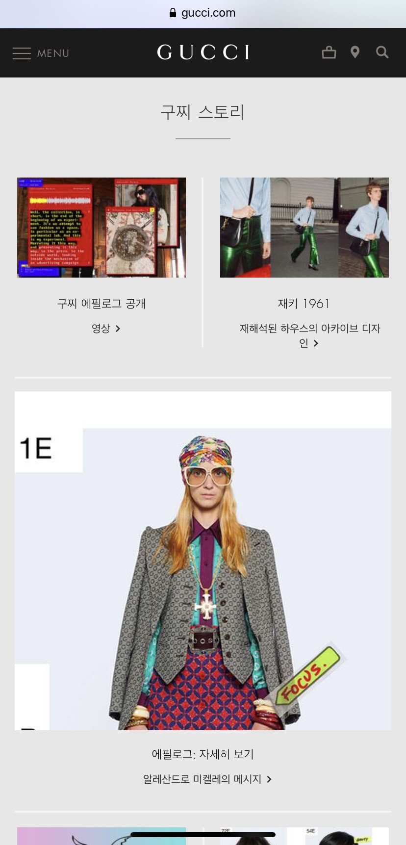 업무 때문에 하이엔드 브랜드에서 구사하는 언어를 조사해야 했다. 구찌 홈페이지를 들여다봤다. 상단에는 재키 백에 대한 예고와 2020 프리폴 컬렉션, 그리고 GG 엠보스 백이 띄워져 있다. 스크롤을 내리자 GG 엠보스 백의 누끼 컷이 넓은 영역을 단출하게 채웠다. 이어지는 화보컷. 자세한 내용은 ‘더 보기’로 제시된다. 볼드 처리나 눈에 띄는 서체가 사용되지 않은 것이 특징. 다음으로 홀스빗 모티프를 활용한 슬리퍼가 등장하고, 이를 유기농으로 생산된 소재나 재활용 소재로 만든 컬렉션이 뒤따른다. 하단에는 브랜드의 현 관심사를 드러내는 캠페인이 놓여있다. 환경에 대한 입장과 젠더 폭력 반대 등 사회 이슈에 대한 의견을 표출하고 있다.
