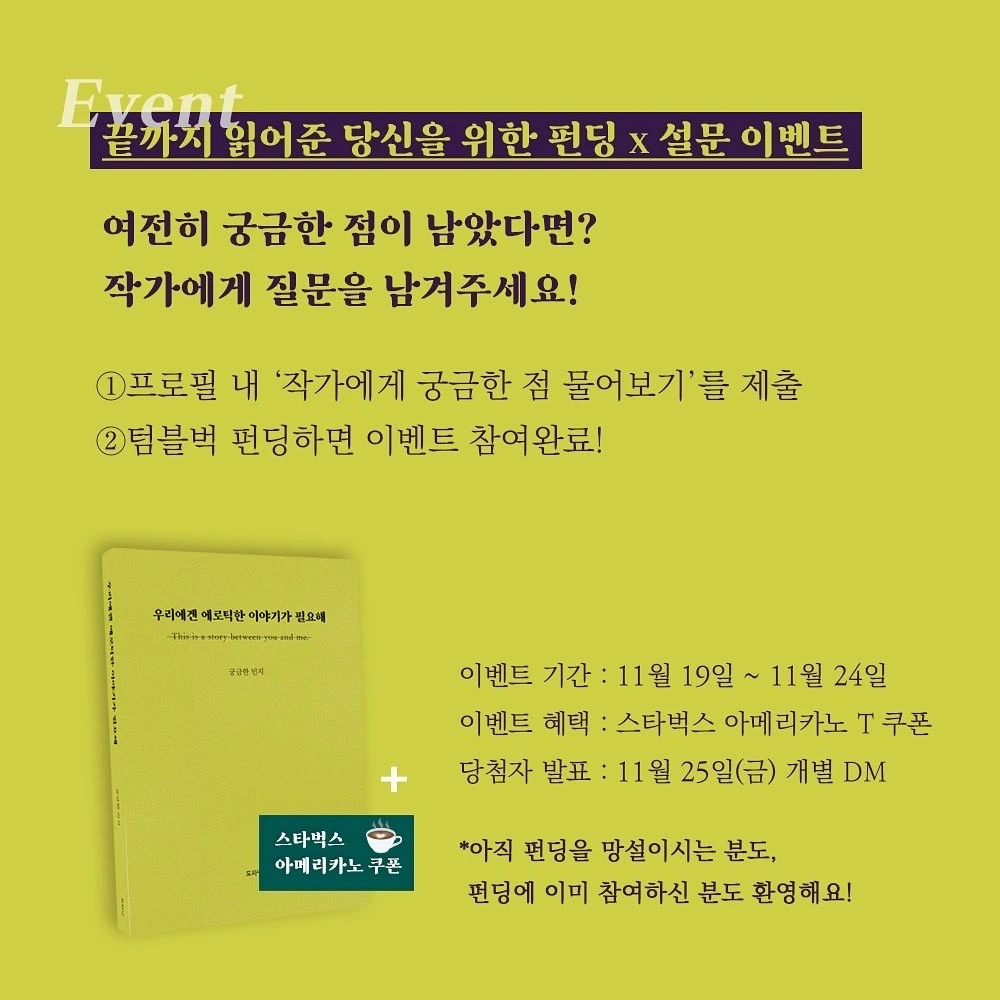 이벤트 참여 : (1)작가에게 궁금한 점을 네이버폼 양식에 제출 (2)텀블벅 펀딩하면 끝! (이미 완료하신 분은 스킵)