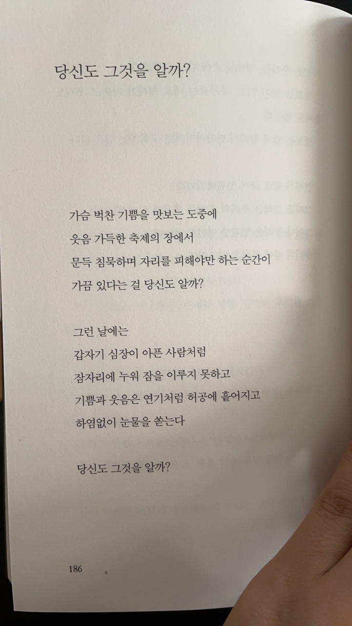 버지니아 울프의 소설과 함께 사게 된 것이 우연이 아니라 느껴진다. 시각적인 즐거움이 있어서, 글씨의 모양마저 무늬로 보인다. 주문을 중얼거리는 것 같은 흐름들이 많았고, 머릿속의 의식이 흐르는 강물에 얇은 종이를 살짝 덮어 떠낸 느낌이다. 시 한 개마다 와 전체의 흐름이 연결되는 것이 책 한 권의 시집의 소중함을 알려준다. 이전의 시와 그다음에 등장하는 시 내용이 키워드가 연결되는 경우가 많았다. 사진 속 말이 이 책의 주제 같다.