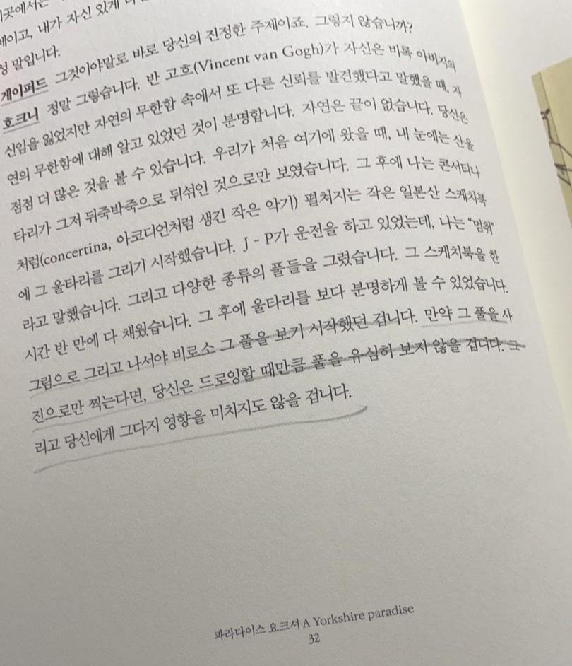 줄을 리을자로 서서 보았던 호크니의 전시 이후, 볼 책 목록에 있었던 한 권이었다. 전시에서도 따로 상영해주던 다큐멘터리가 아주 인상적이었는데, 이 책에서도 인터뷰이의 멋진 태도가 책을 이끌어간다. 10년간 나눈 대화를 한 권으로 엮었고, 살아있는 거장으로 불리는 이유를 조금이나마 느낄 수 있다.