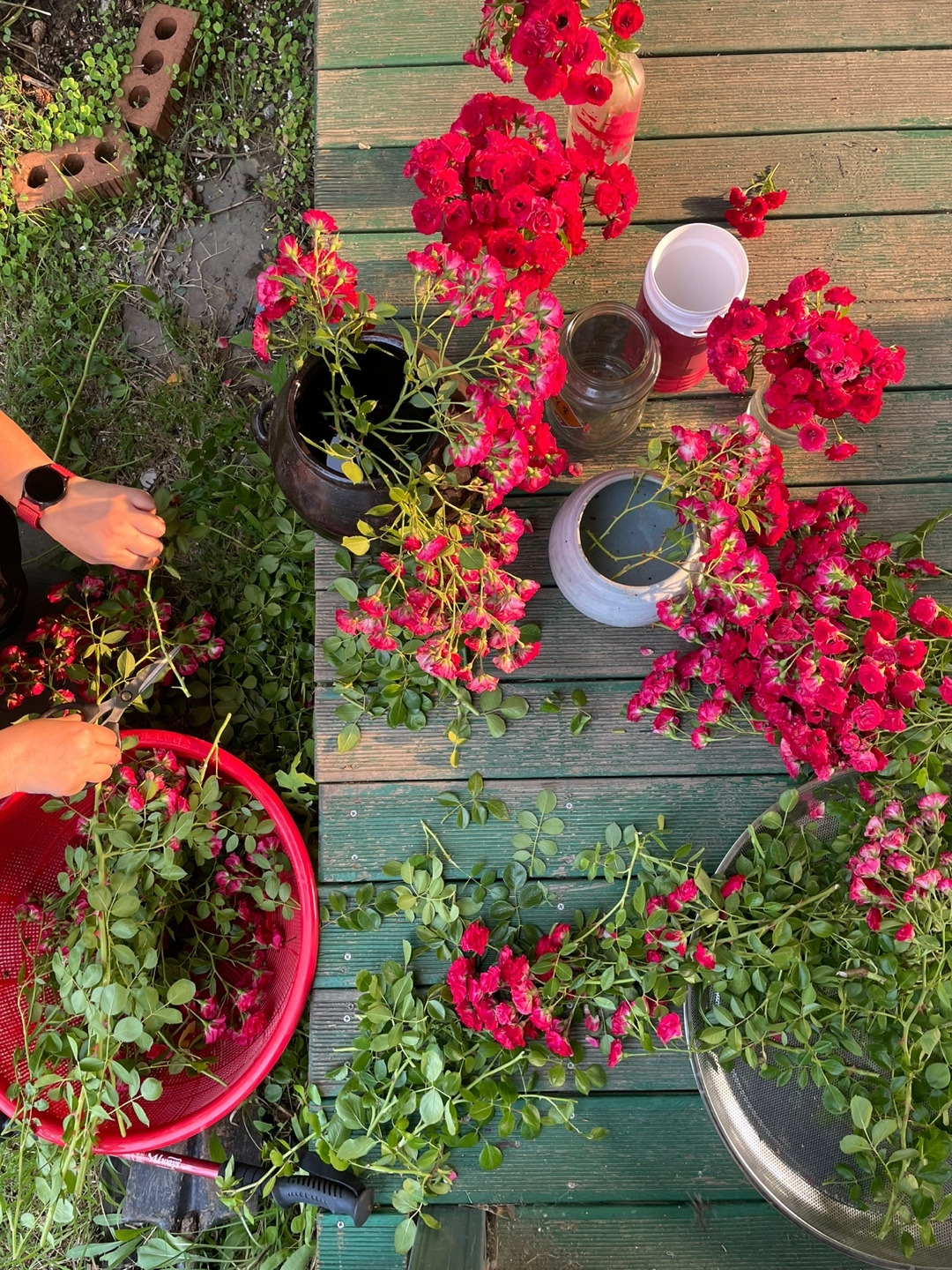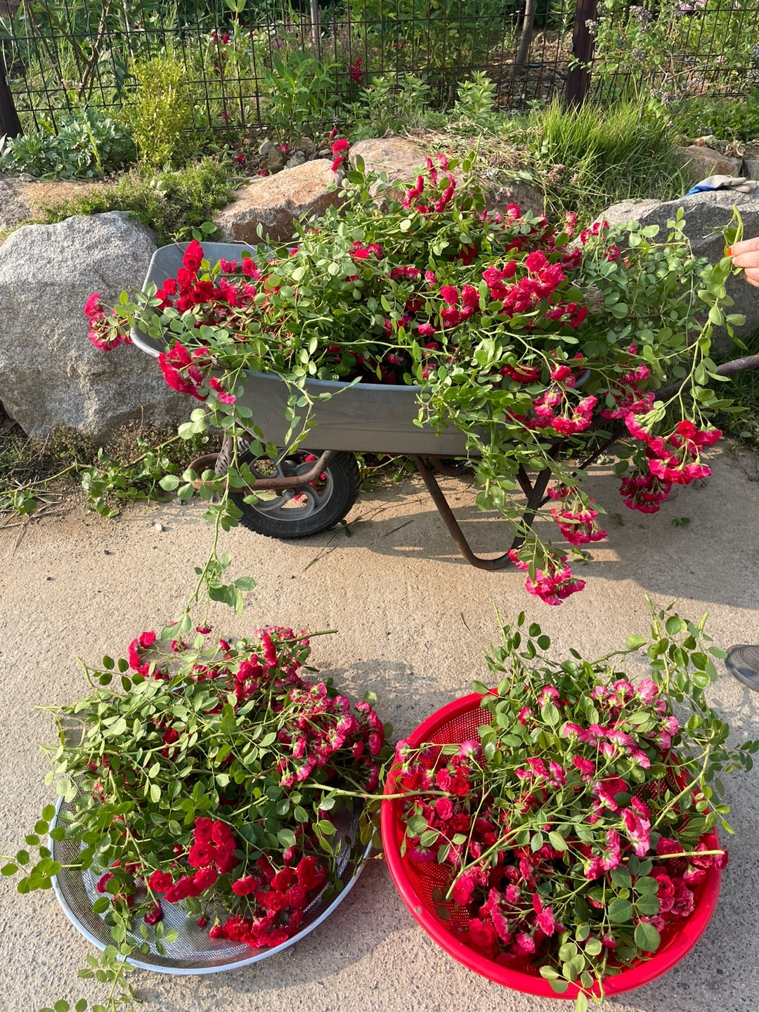 며칠 전에 보기만 하고 군침을 흘리던 앞집의 장미가 집 안으로 성큼 왔다. 가을을 위해 미니장미를 가지치기하던 중, 수레째로 가져가라 하셔서 때 아닌 진풍경이 펼쳐졌다. 그림 그리던 친구가 김장 담그는 모습 같다 할 정도로 데크가 빨간 장미로 가득! 온갖 꽂을 수 있는 통은 다 나와서 여기저기 물에 담가 두고, 몇 개는 묶어 이곳저곳 선물하였다.