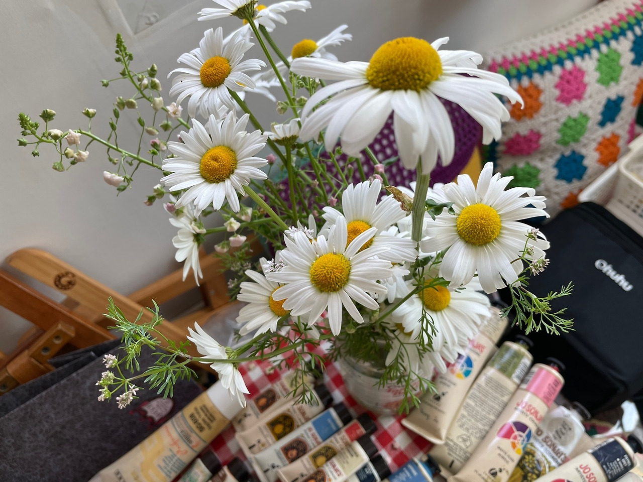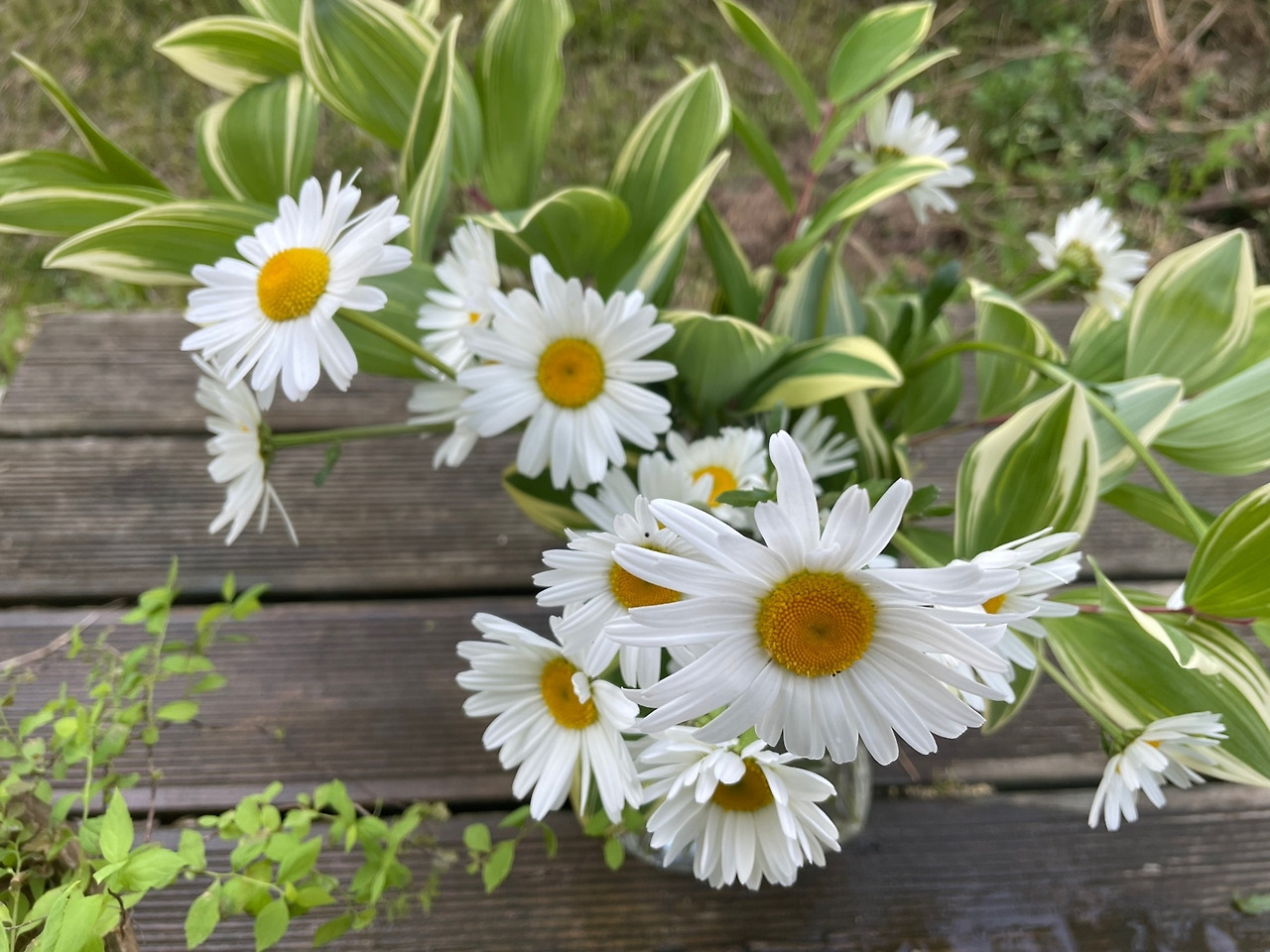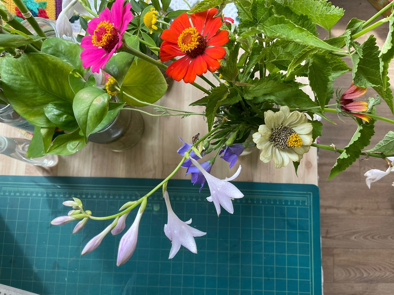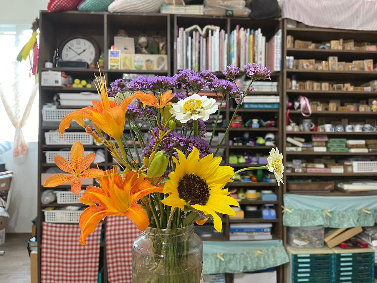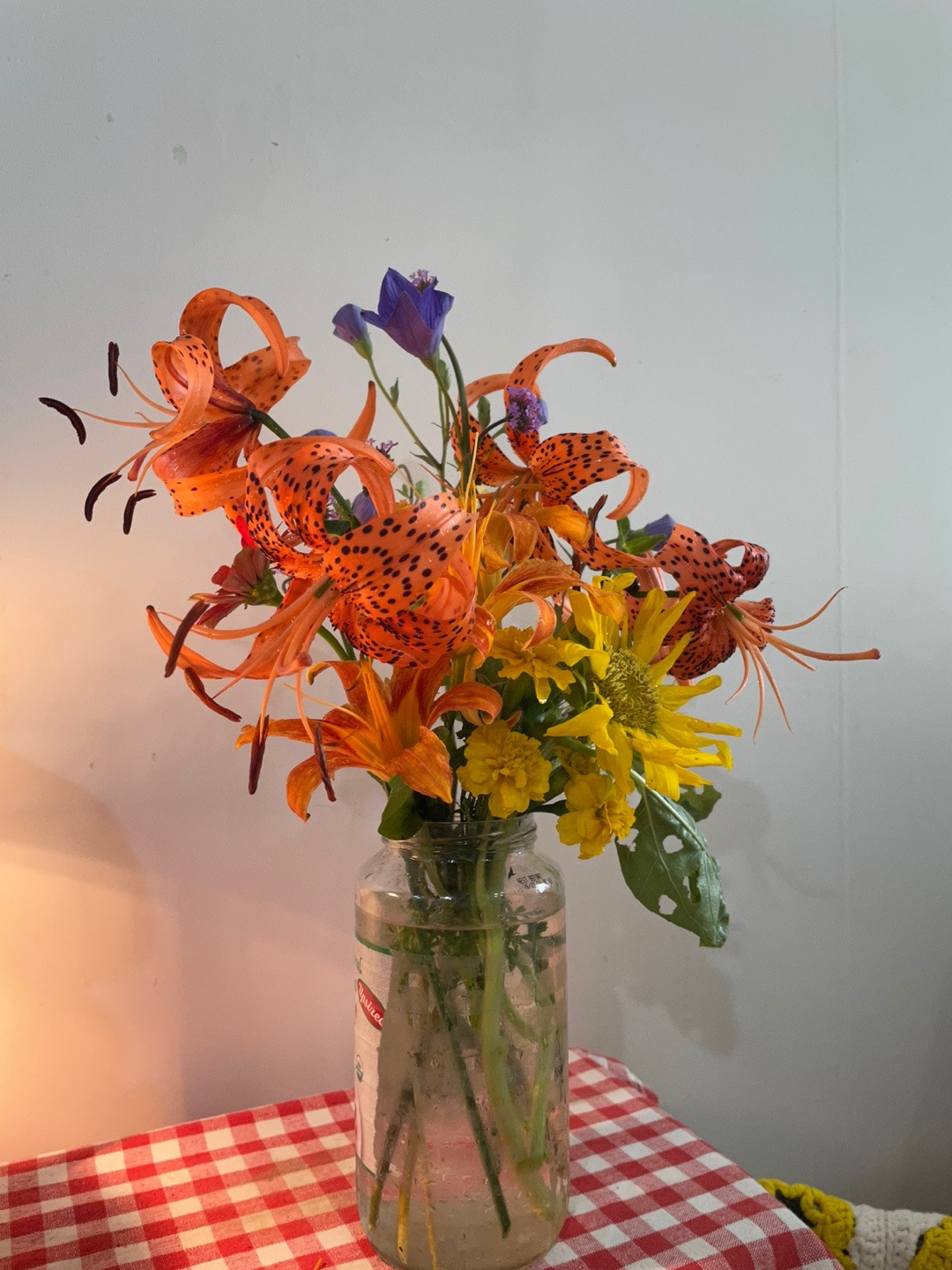소나기와 햇살이 공존하는 날. 비가 많이 와서 넘어진 꽃들을 과감히 잘라 데려다 두었다. 기개가 보이는 나리꽃, 소박하고 작은 해바라기, 수수한 도라지꽃, 한결같은 메리골드, 하늘하늘한 원추리. 화려한 애들을 잔뜩 골라 꽂아두니 마음이 왕 같다.
