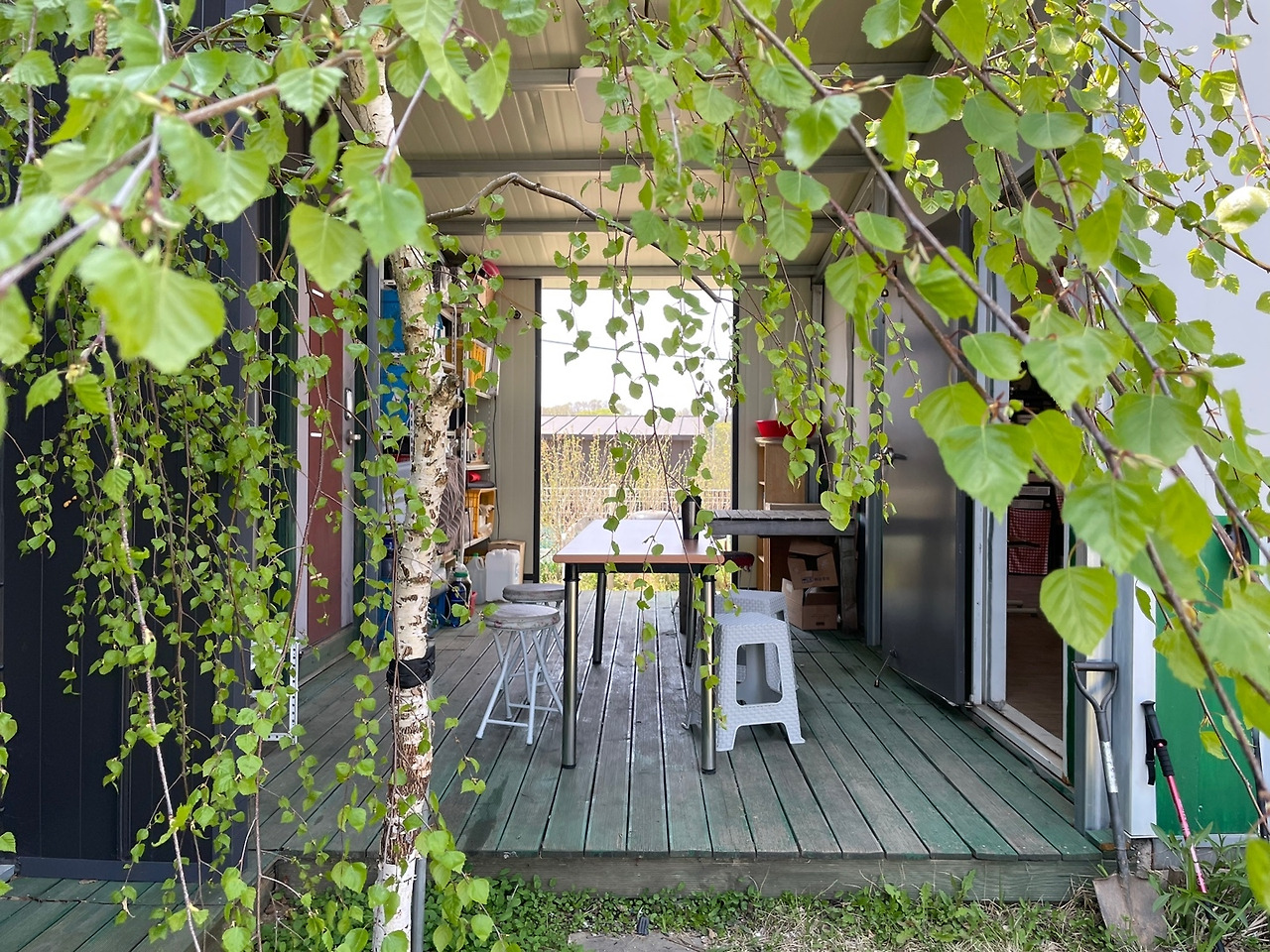 오늘도 역시 밖으로 낑차 책상을 빼두고 기꺼이 야외 수업을 기다리는 중. 일 년에 몇 안 되는 춥지도 덥지도 비, 눈도 없는 이런 날들을 즐겨본다. 항아리 가득 담아둔 아로니아 가지와 함께!