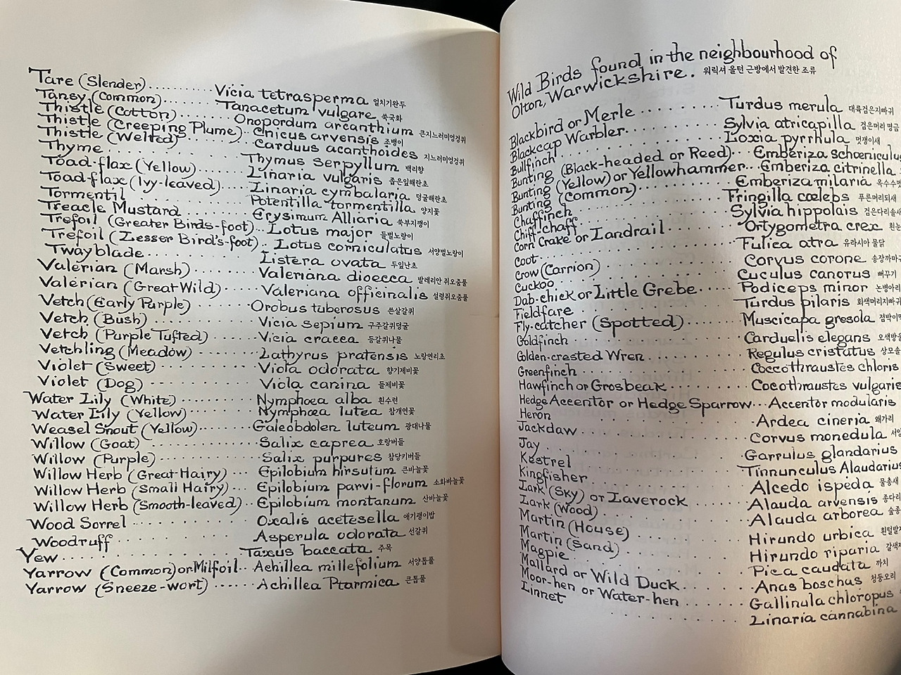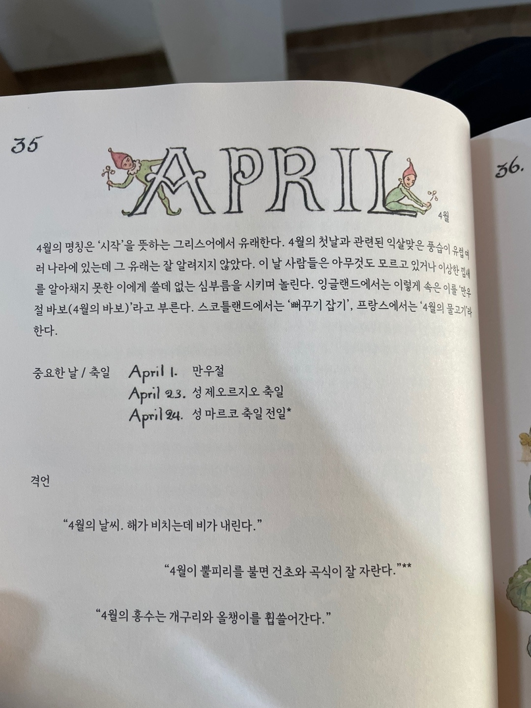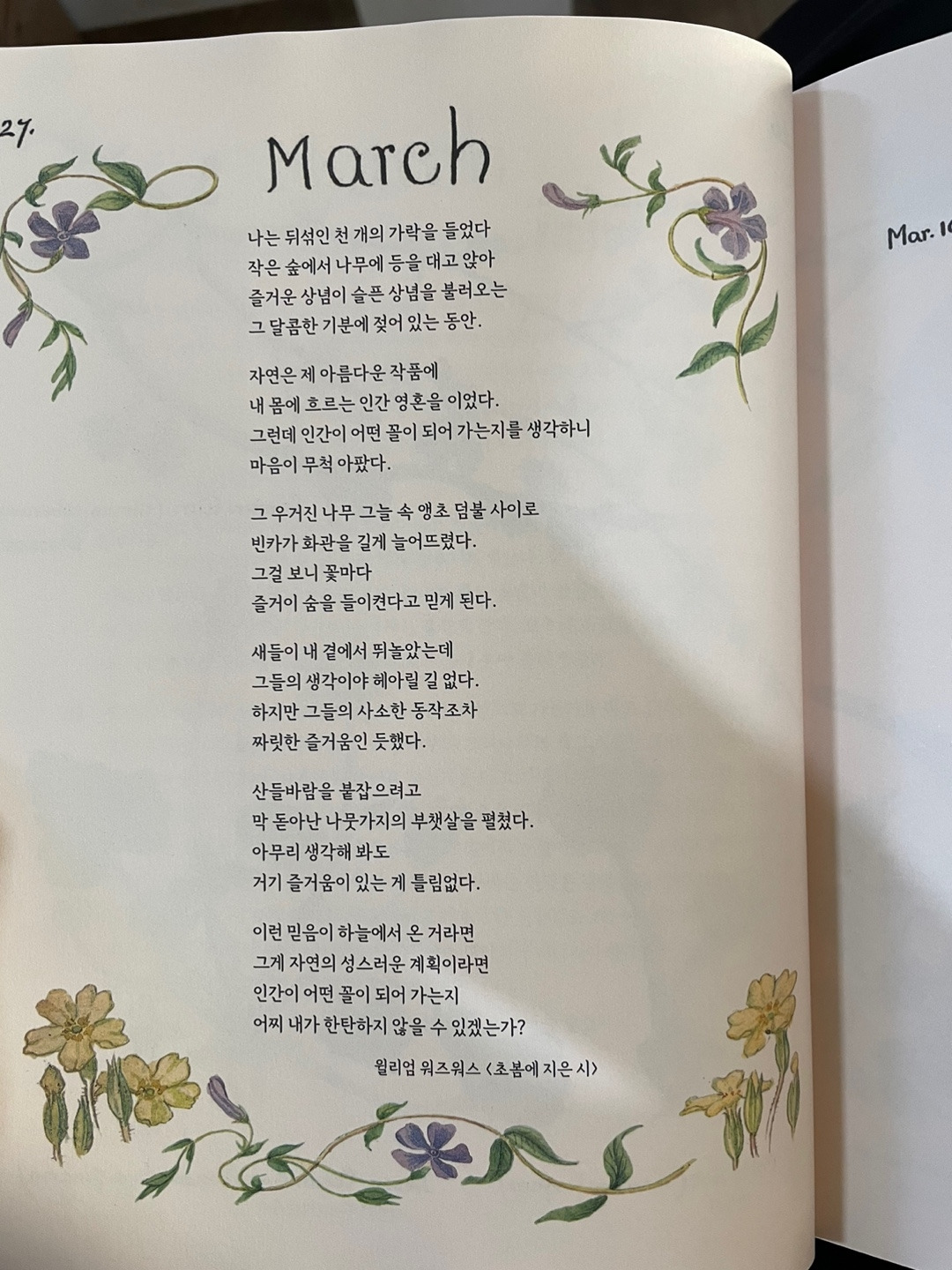 정말... 침 줄줄 흘리며 봤다. 그냥 글씨도 다 취향난사. 무조건 좋아하는 종류의 책. 자연 관찰 일기로 매우 예전인데도 유효한 내용들이 많다. 그림 중 흰 꽃 표현이 특히 아름답다. 새와 나무 식물, 그해의 날씨, 바람이나 햇살 온도 등의 내용이 담긴 이런 기록을 해보고싶다는 의욕이 생긴다.