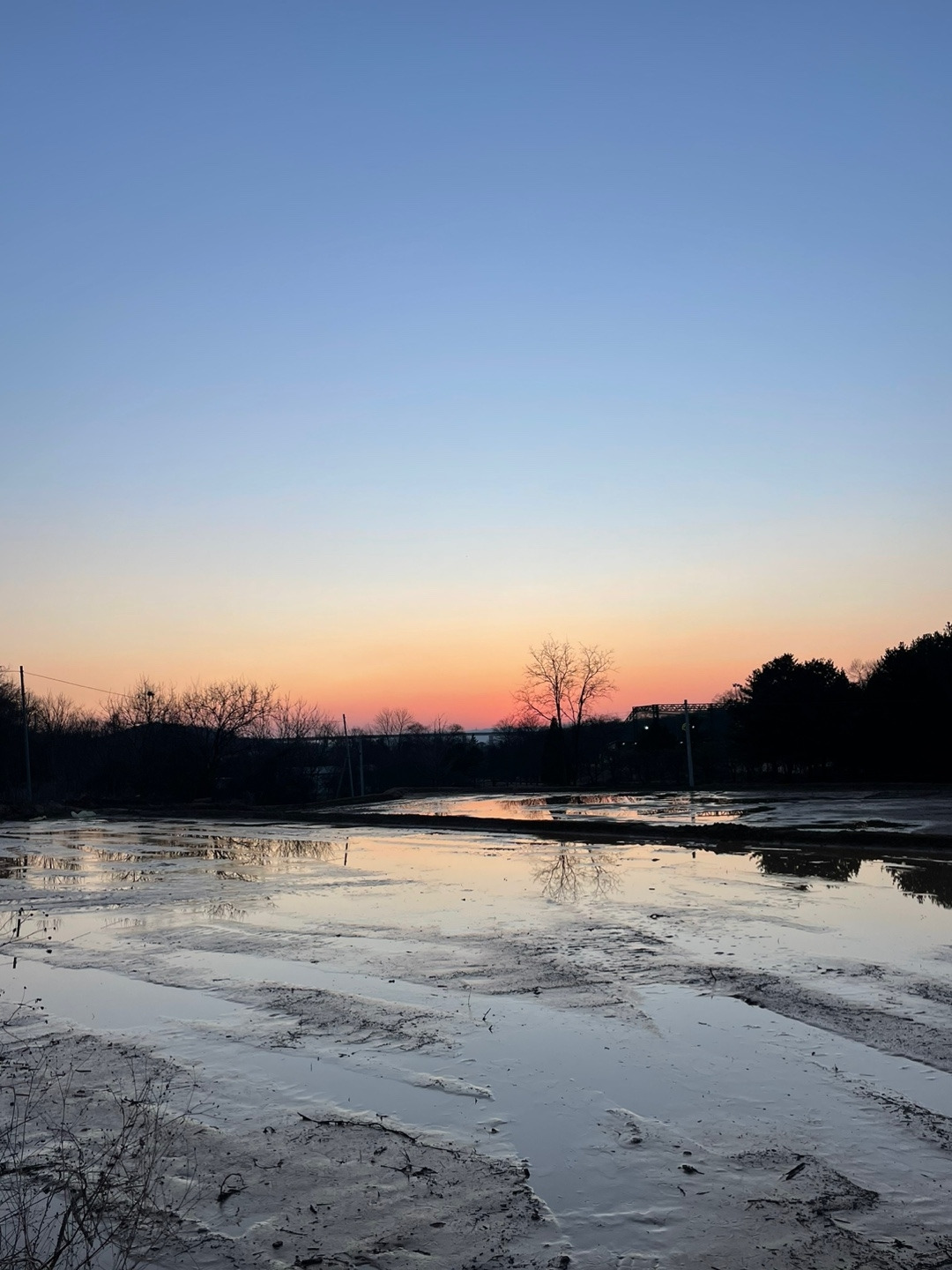 얼음이 얼어 거울이 된 논 위로 노을이 지는 1월의 일상