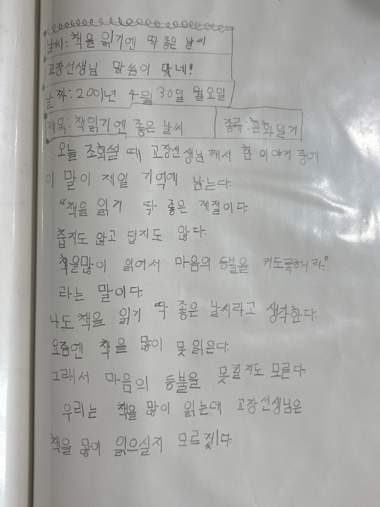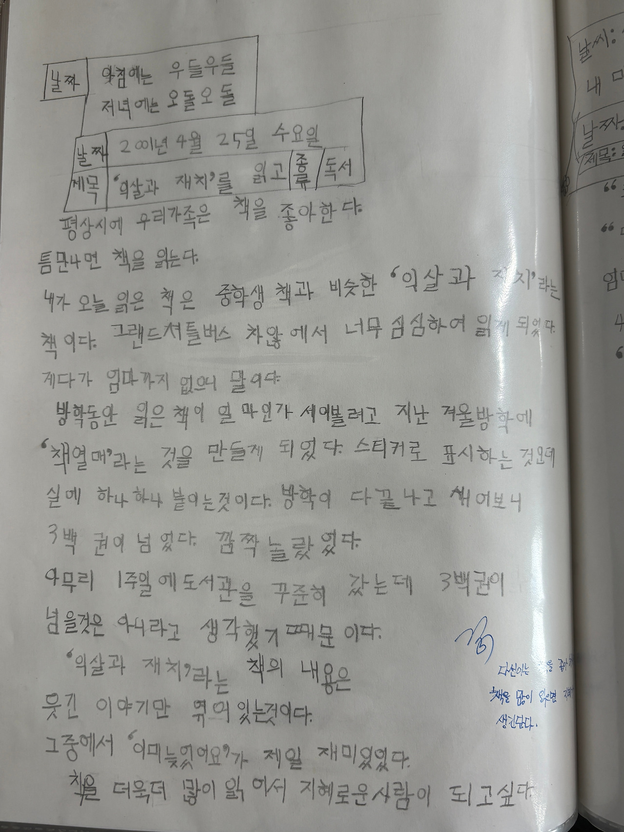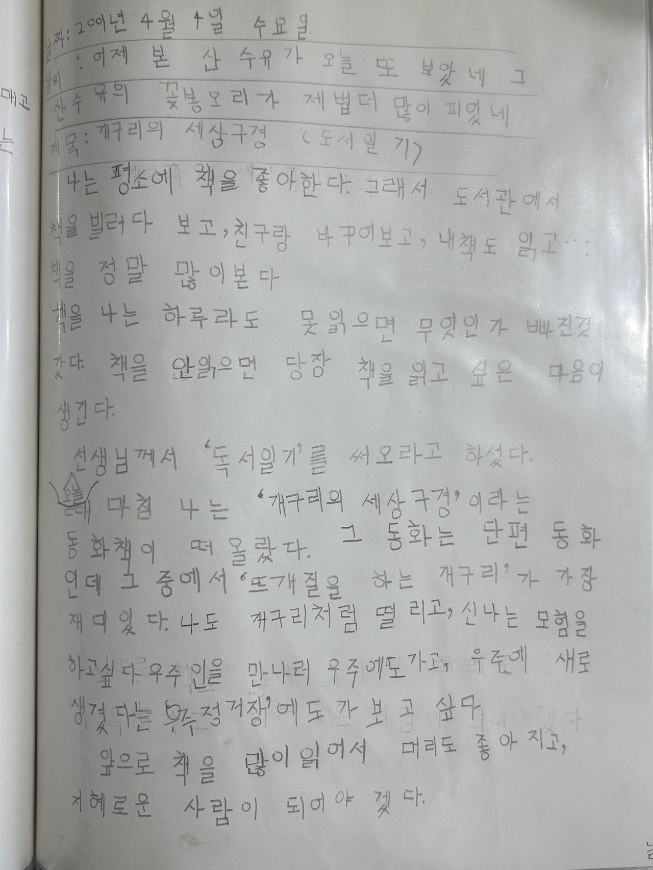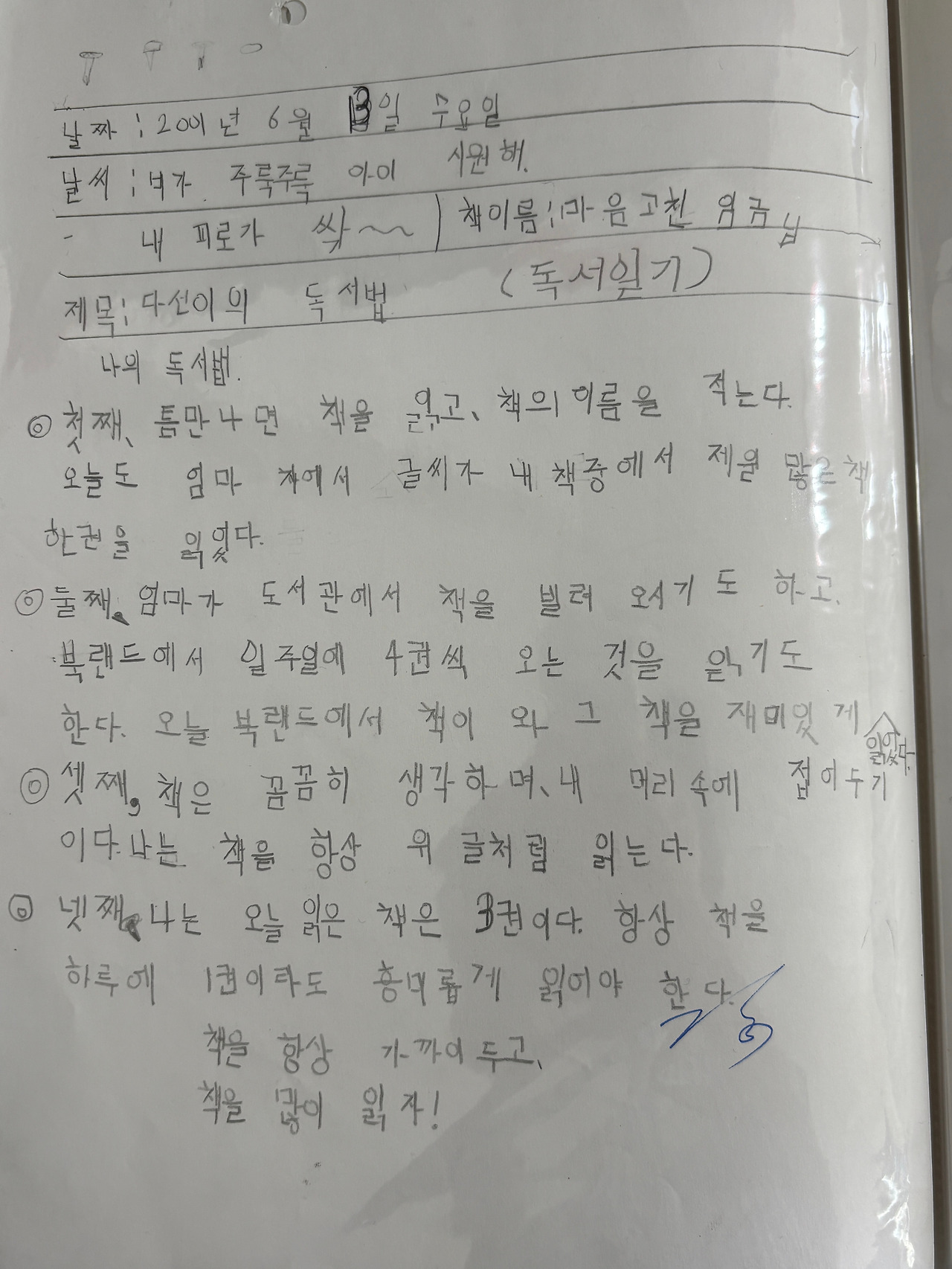 어제는 책장을 뒤적이다 초등학생 때 쓴 일기가 들어있는 파일을 발견했다. 1년간 매일 쓰인 종이들이 가득 들어있었고, 그중에는 방학 동안 300권을 읽었다고 적어둔 페이지도 있었다. 조끄만 것이 멋있었구나...
