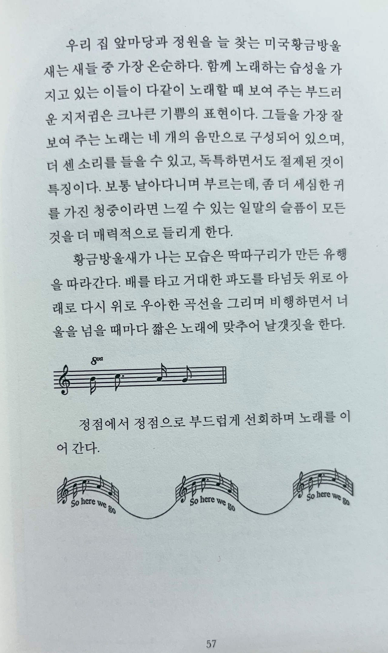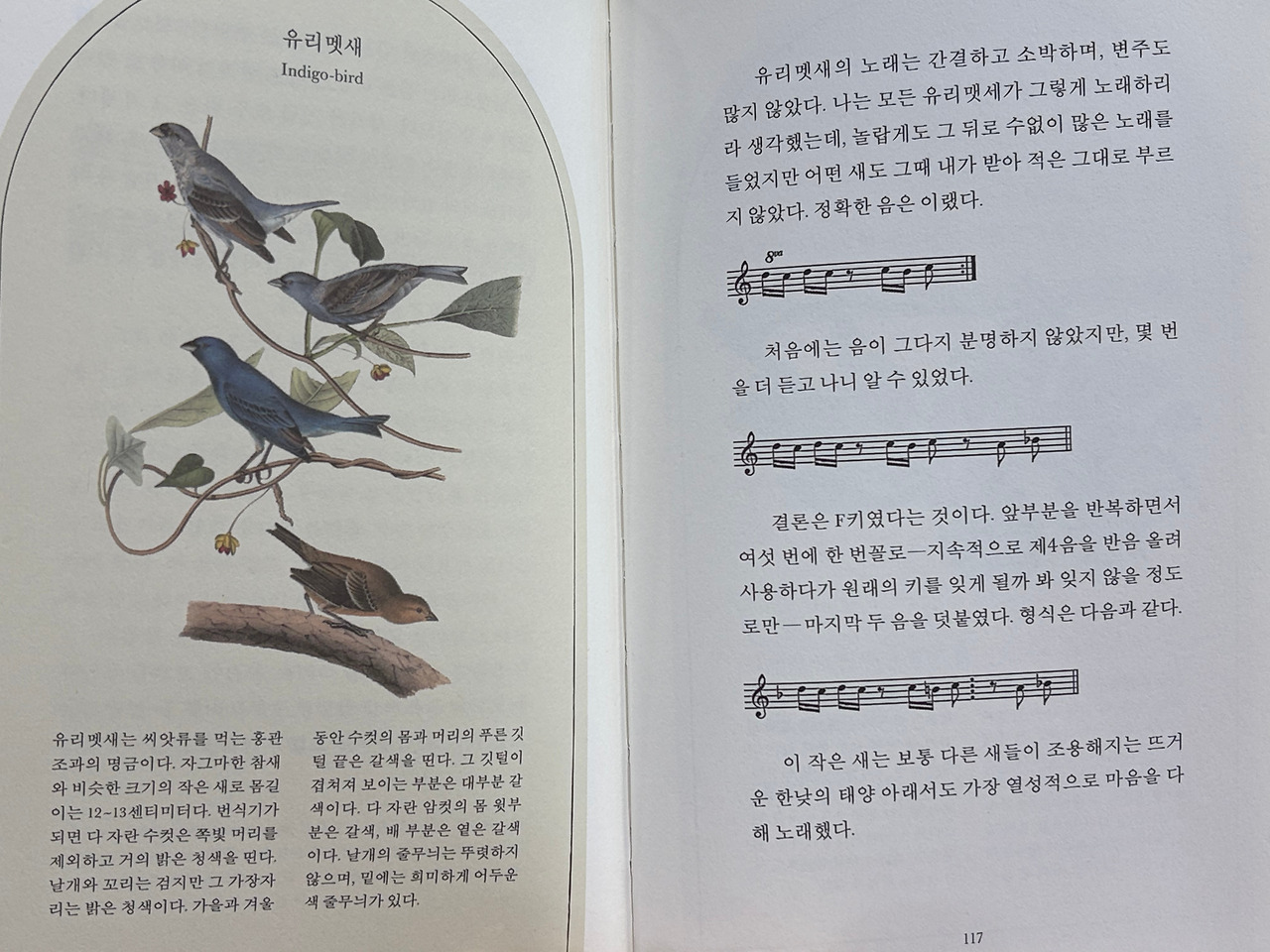 19세기의 지휘자가 마국에 있는 새들의 울음소리를 관찰한 일지이다. 새의 노랫소리를 악보로 남겼는데, 분석된 표현들이 신선하게 다가온다. 참새의 종류가 이렇게 많았다니! 파스칼 키냐르의 작품에 등장했다고 하는데 오랜만에 그 작가의 책들 또한 찾아봐야겠다. 이렇게 꼬리의 꼬리를 무는 독서생활!