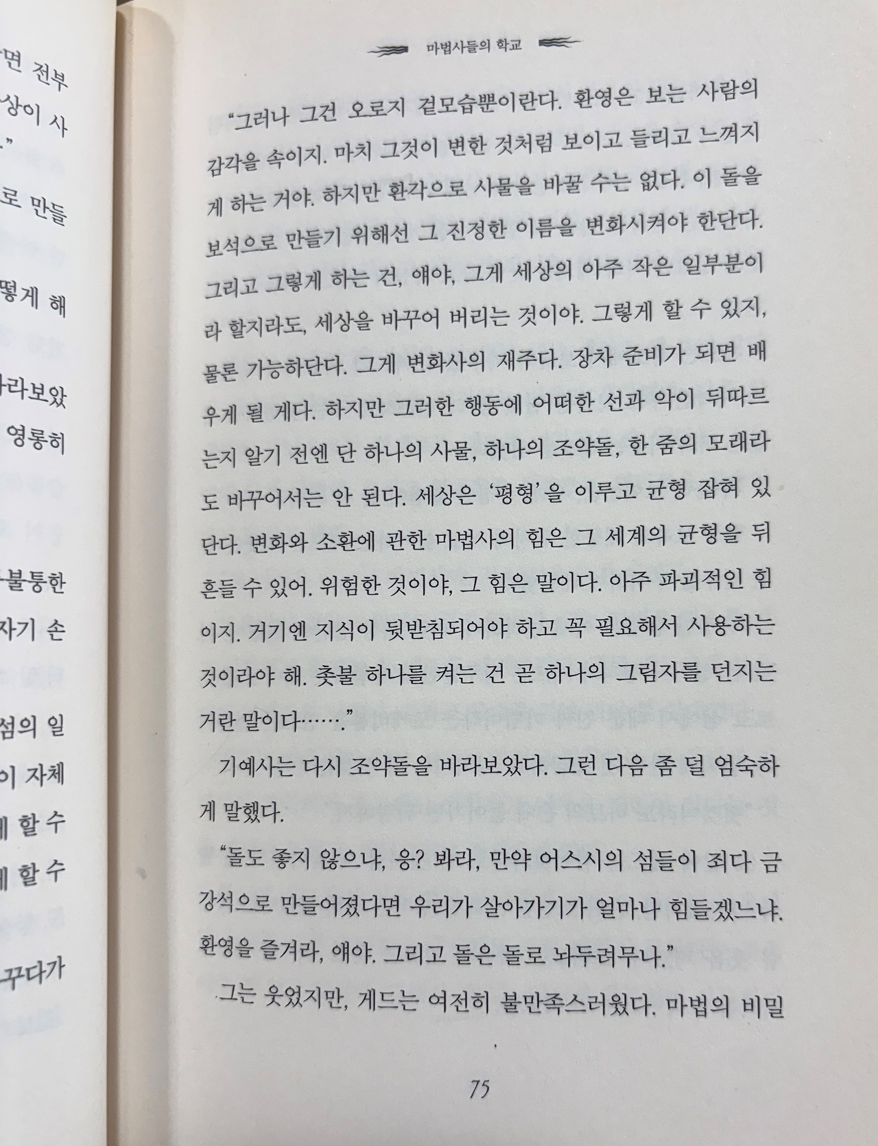 그리고 사실을 깨달을 수 있었다. 게드는 이긴 것도 진 것도 아니며, 다만 자신의 죽음의 그림자를 자기 이름으로 이름 지음으로써 자신을 완전하게 한 것이다. 그로써 그는 한 인간이 되었다. 진정한 자아 전체를 깨달은 인간이며 자신 아닌 그 어떤 힘에 이용당하거나 지배받지 않을 사람, 살기 위하여 살며 결코 파괴나 고통이나 증오나 어둠을 섬겨 살지 않는 인간이 된 것이다.