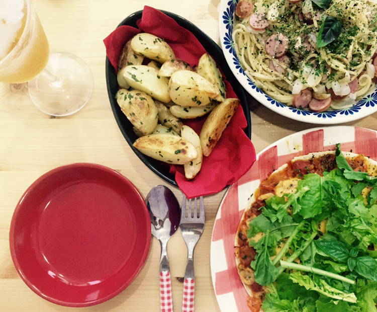 피자에 토마토를 넣을거라 파스타는 오일 파스타를 해보았어. 짧은 양식 경력이지만 이것 저것 파스타를 맛보고 다녀보니 결국 오일 파스타가 제일 맛있더라구. 양은 언제나 잘 모르므로 그냥 통에 남아있던 면을 후룩 쏟아서 다 삶기. 내가 좋아하는 마늘과 양파는 많이! 내가 칼 쓰는 모습을 차마 보지 못하는 엄마가 멋있게 딱 썰어주셨어. 사실 오일파스타를 만들어 보느건 처음이라 떨렸지만 맛있는 걸 그냥 다 넣고 볶으면 당연히 맛있는 거 아니겠니? 근데 생각보다 정말 많은 양의 기름이 들어가더라구. 왜인지 죄책감이 살짝 들어서 퍽퍽하더라도 기름은 덜 넣었어. 어차피 불기 전에 다 먹을꺼니까! 소금으로 간을 한 후에는 모든 요리의 완성은 마이 페이보릿 향신료 후추! 레스토랑에서 먹는 파스타처럼 동그랗게 말아서 예쁘게 담고 싶었지만 결국은 후라이팬 째 쏟게 되는 어려운 플레이팅. 볼터치처럼 마당에서 따온 바질 두 잎으로 마무리! 기대보다 맛있어서 너무 행복했어. 물론 당연히 깨끗하게 비웠지.