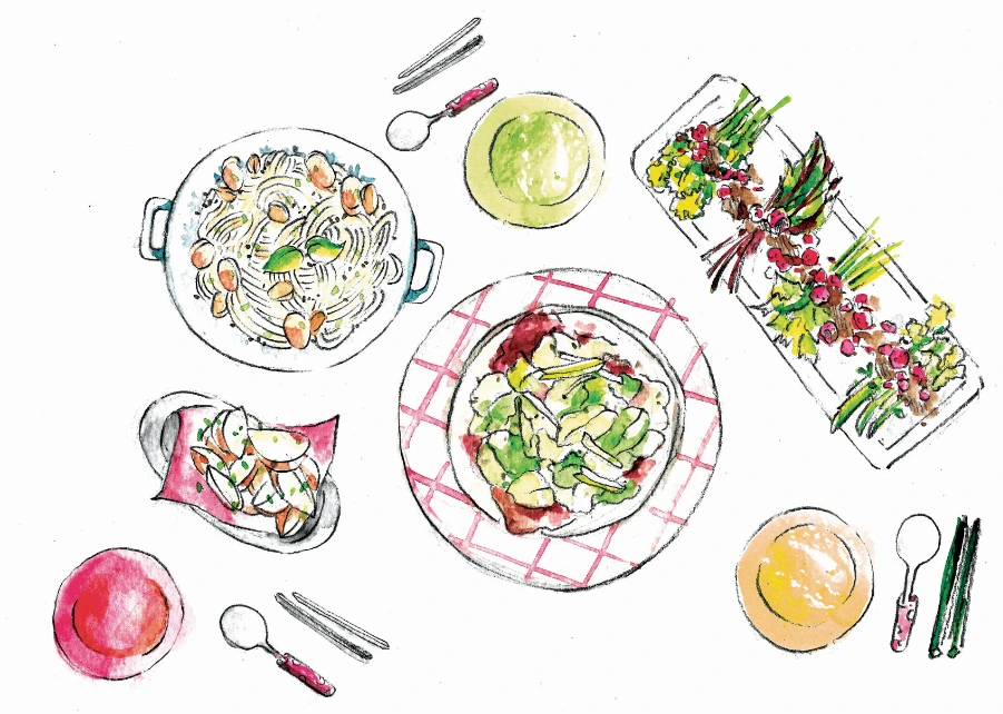 기분 좋게 배가 부르다. 크게 앓고 난 후에 입맛이 없어서 금방 배부르더니 어제 오늘 너무 맛있는 음식을 많이 먹었어. 날씨가 따뜻해지기만을 기다리던 겨울날의 우리 가족은 땅에 먹을 것을 맡겨놓은 것 마냥 기다리곤 했지. 그러다 날이 풀리고 스물스물 기운이 올라올 때 쯤 냉이를 시작으로 낮에는 마당일을 못할 만큼 더운 지금까지. 내 뱃속에 있는 것들 중 절반은 다 이곳에서 준 것들일 거야. 아빠 말처럼 자연냉장고에 맡겨두었던 음식들로 매일의 끼니를 만들고 있어. 오늘은 도시음식이 그리웠던 모녀가 뚝딱 만들어낸 저녁을 소개하려고 해. 방금 먹은 그 음식들 말이야. 기억나? 저번 편지에 사랑하는 사람들과 맛있는 음식을 먹는다는 건 기적과도 같을 정도로 행복한 일이라고 했던 말. 오늘도 그 말처럼 평온하고 흡족한 저녁시간이었거든. 다음에 놀러오면 꼭 해줄게. 같이 먹자. 뒷산과 마당에서 나온 재료들로 만든 오늘의 저녁, 짜란!