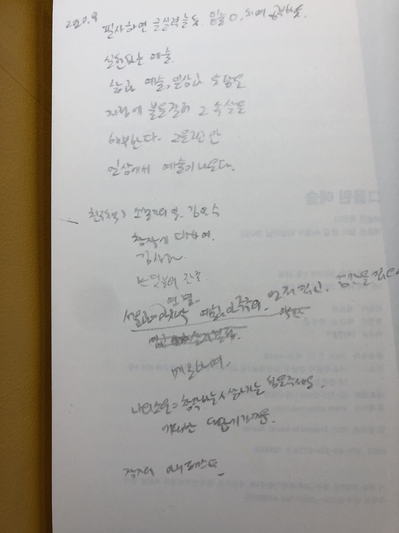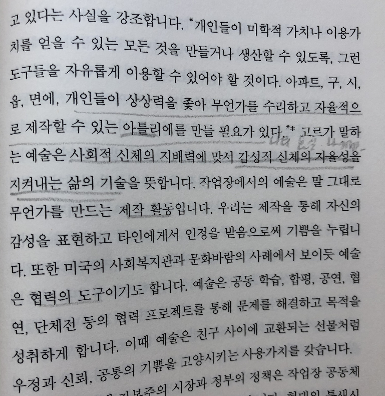 3년 전 빌려 읽고, 이번 기회에 소장했다. 작가의 매니페스토가 담긴 책으로 서문과 마지막이 연결이 된다. 5부 예술과 민주주의를 먼저 읽고 중간을 읽길 추천한다. 소원을 빌 기회가 있을 때마다 읊조리는 말은 '창작하는 사람으로 살아가는 힘을 주세요'인데, 이에 대한 대답에 가까운 책이 아닐까 싶다. 필사하면 글 실력이 늘 듯하다. 밑줄 치며 공부하듯 읽었다. 실천하는 예술. 삶과 예술. 일상과 맞닿은 지점에 불을 질러 그 속살을 해부한다. 그을리고 만 일상에서 예술이 나온다.