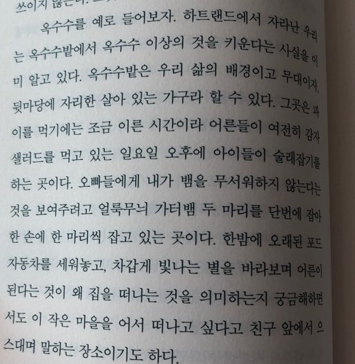 진짜 재밌는 소설은 이렇게 한 숨에 읽게 된다. 읽는 내내 밖에서 이상한 소리가 들려 약간 시달렸지만, 잊을 만큼 집중했다. 덮을 수 없었고, 아름다웠고 눈물을 조금 흘렸다. 자신이 살아온 곳을 이렇게 그려내는 게 자연에게 돌려주는 길일지도 모른다. 날씨와 풍경 묘사는 앤이 떠올랐고, 외롭고 단단한 소녀는 어른들의 거짓된 삶의 주인공이 떠올랐다.