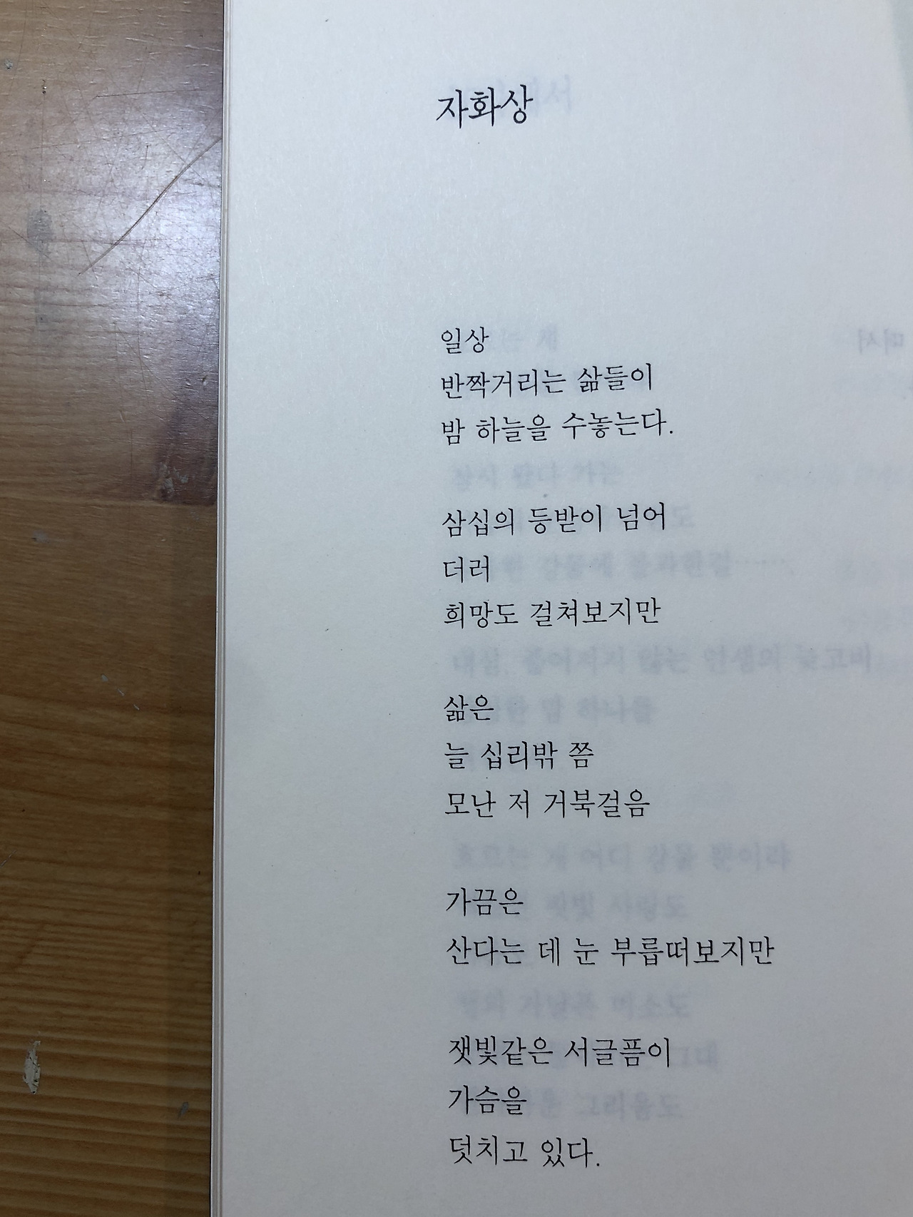 배곫고 궁한 시절에도 사람 살이는 같다. 끓는 마음과 회한이 묻어있는 짧은 어조가, 시집에선 드물게 사진과 함께 있다. 익숙하지 않은 예전 단어들이 많다. (다른 책들도 그렇듯 옛날 남자가 썼다는 사실을 감안해야 함)