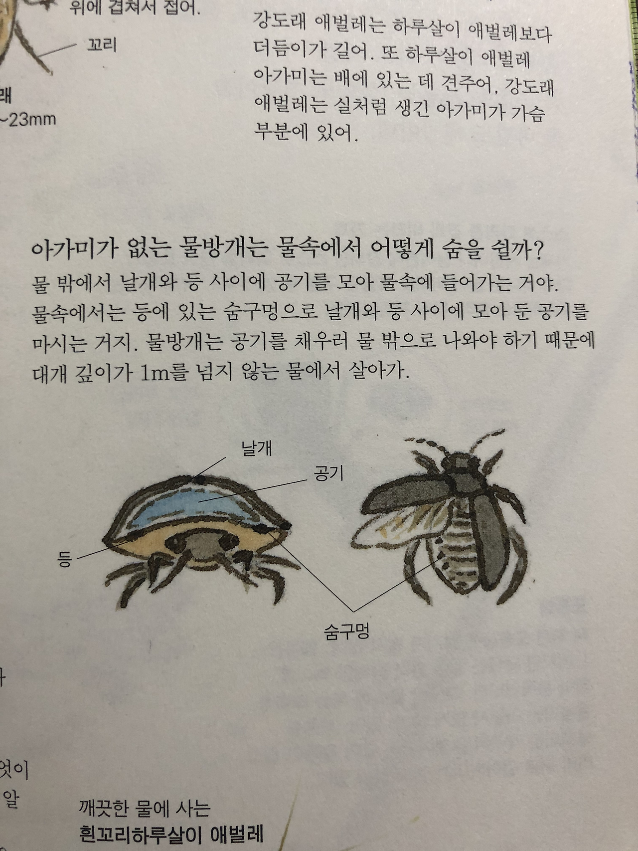 물방개는 아가미가 없지만 몸통 사이에 공기를 모아 물속에서 숨을 쉴 수 있다.