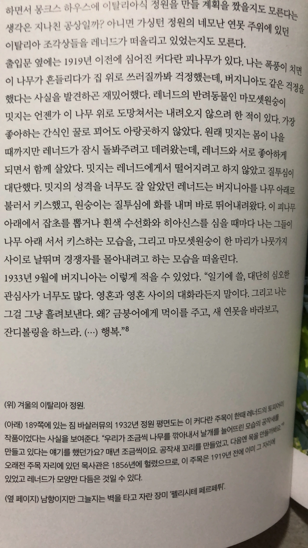 방대한 양을 아우르는 꼼꼼한 조사와 그걸 엮어내는 모습이 <외로운 도시>를 떠올리게 했다. 버지니아 울프라는 사람이 가진 이야기도 워낙 강렬하여 여러 글로 다시 쓰이곤 했는데, 이 책에서 만큼은 불행이 앞서지 않는다. 끝내 휘몰아 빠뜨린 감정, 남편과 나눈 우정과 사랑은 여러 색의 장미에 가려져있다. 그저 지나온 시간들에 있었던 정원의 모습만이 기억될 뿐이다. 작가가 집을 구매하기 전의 모습과 살 때의 모습과 현재 모두 관통하며 나무 한 그루, 꽃 더미가 어떻게 그 공간을 지켰는지 알 수 있다. 촘촘한 설명에 최소한 내가 그 집의 돌계단이라도 되었던 듯한 착각 속에 몰입된다. 마치 예전에 다녀왔던 여행지처럼 사과나무와 부엌의 창가, 오두막 작업실을 머릿속으로 거닐 수 있다.