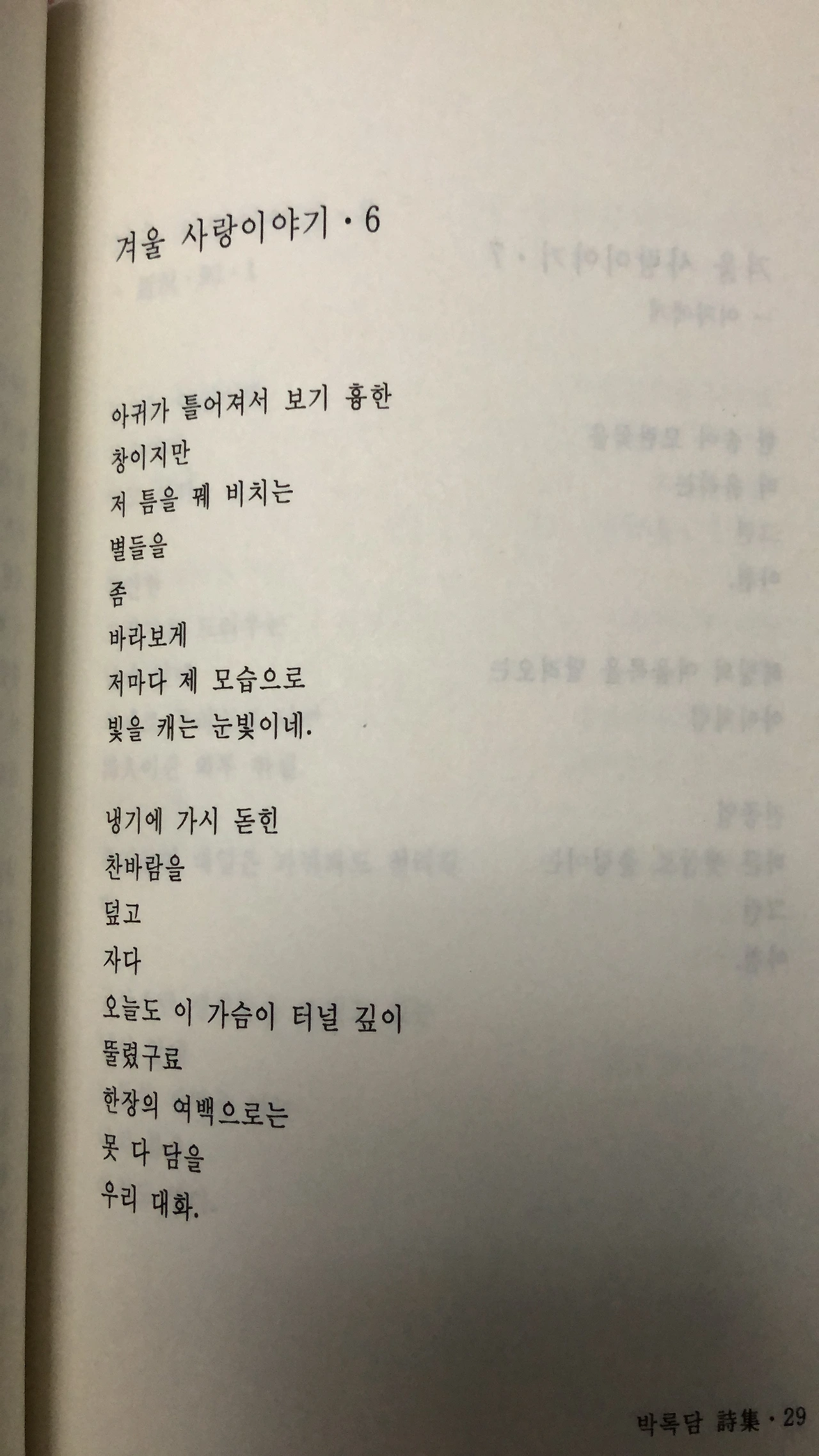 엄마와 이모가 모아둔 시집들 중에 가끔 고른다. 지금에 비해 정열적이고 연극 같은 분위기가 보고 싶을 때가 있기 때문이다. 낯간지러운 낭만, 멋쩍게 간지러워진 말들이지만 여전히 유효한 마음. (예전 시집이라 처녀 여가수 젖가슴 주의... )