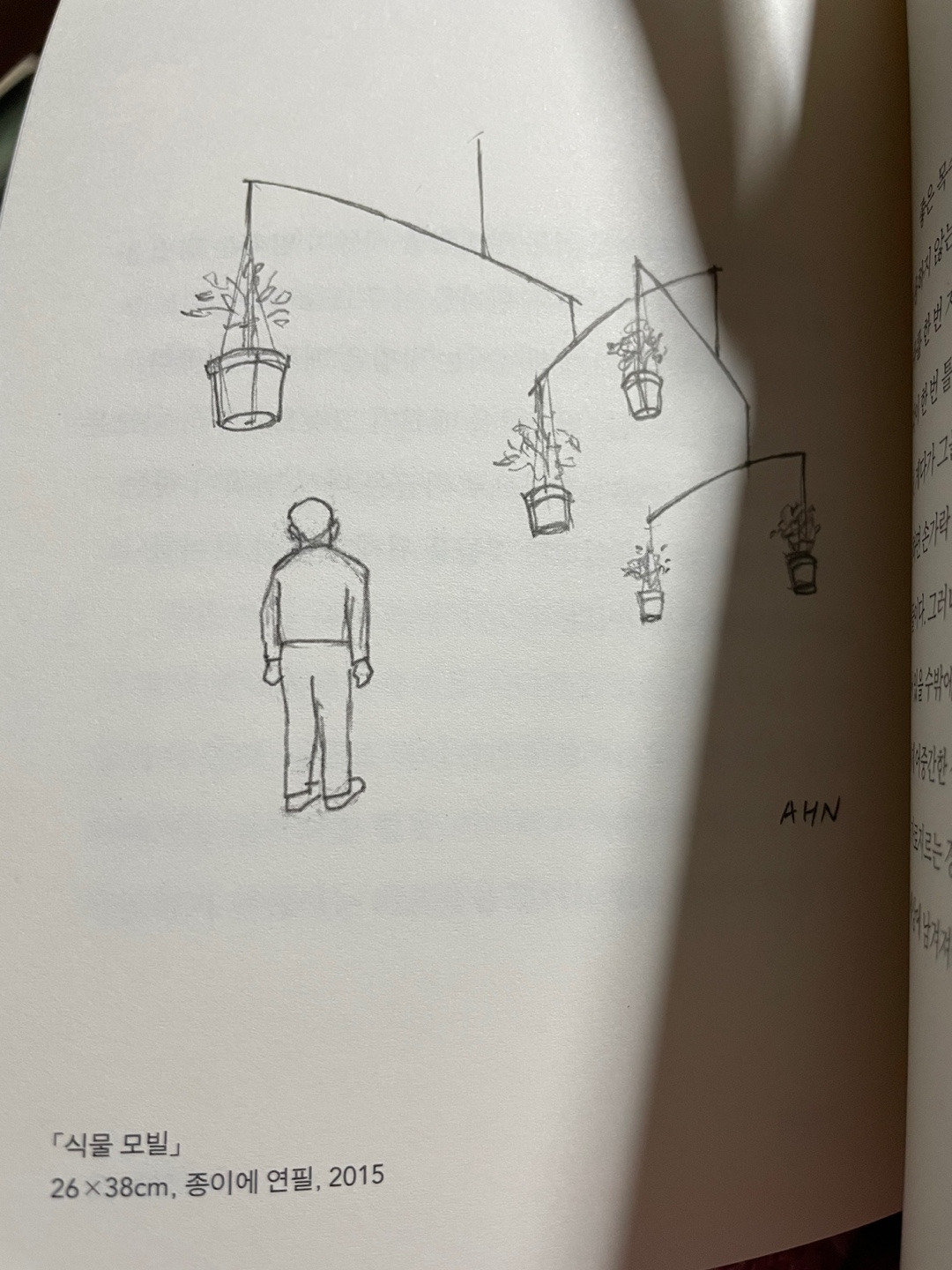 무거운 화분이 모빌처럼 전시장의 천장을 유영하는 모습은, 상상과 분석이라는 공존하기 힘든 두 관계를 묘하게 균형 잡게 하는 작가의 글과 닮았다. 짧은 글과 연필로 그린 드로잉이 묶음으로 이루어져 있는 구성인데, 이런 종류의 묘사를 좋아한다면, 김소연 시인의 마음사전을 추천한다. 좀 더 좁고 날카롭다.