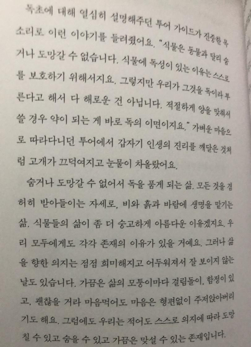 특히 '말들의 폐허' 부분에서 사랑과 희망이 아주 부족한 곳이 오히려 희망 보육원, 사랑요양원이 된다는 점은 평소에 스스로를 체크할 때 쓰이는 주문과도 같은 법칙 같은 거라, 신기했다. 그 외에도 나무가 스스로 골라 가지를 떨어뜨린 다는 것, 씨앗에 관한 단상, 이른 새벽의 소리, 대성당의 보첼리를 보고, 같은 인간 군상의 결이 느껴졌다.