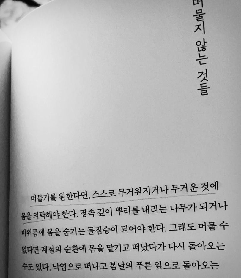 일기장을 뒤적이듯 책장에서 어떤 책을 고를지 서성이다가 골라, 삼 년 전 그었던 밑줄을 다시 읽는다. 그때의 불안함이 기억나고, 불안함은 여전하고 또 달라졌음을 움직이지 않고 기다리던 글을 통해 확인한다.
