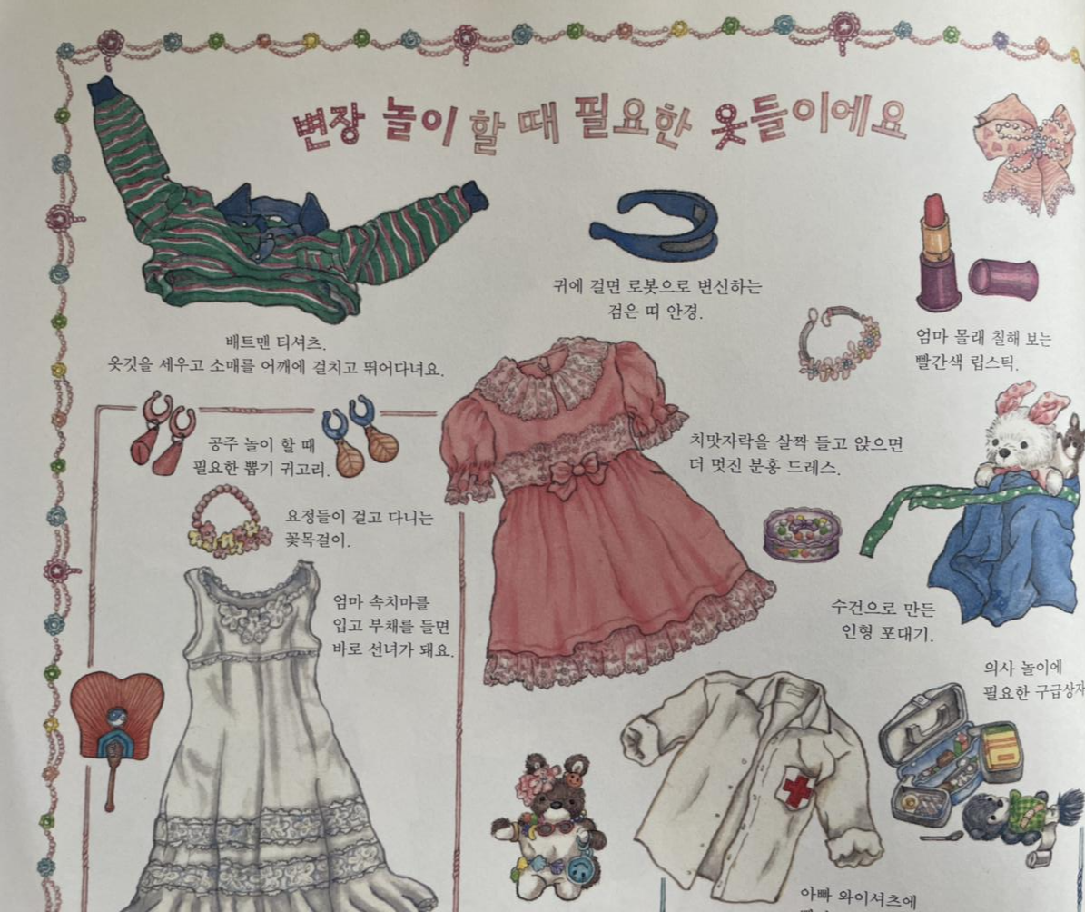 지금 나의 그림들에 녹아있는 분위기와 비슷해서, 또 변하지 않는 그림과 글씨로 있어줘서 고마웠다. 그림 하나하나 살펴보는데 어쩜 이렇게 선명하게 다시 떠오르는지! 특히 보석상자 하트 가방은 가지고 싶어서 종이로 만들기까지 했다. 지금까지도 옷을 물려 입고, 고쳐 입고하는 습관이 이 책을 통해 왔나 보다. 구십 년대 생이라면 공감할 이야기와 아이템이 가득하다.