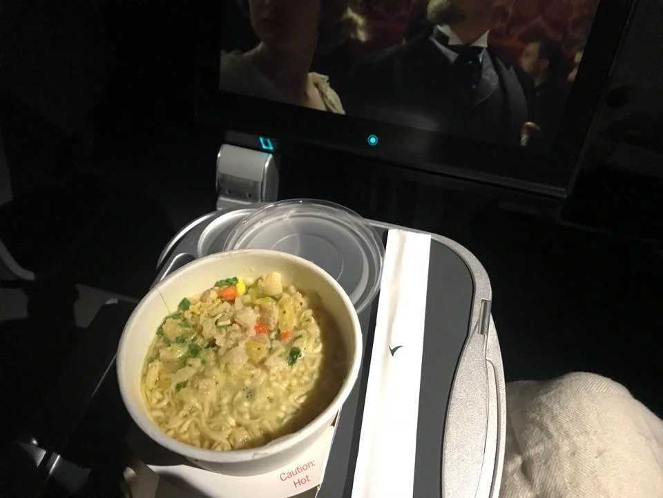 내 건너편에 한국인 여성 두 분도 있었다. 간혹 나를 보는 것 같았으나 어쩌면 내가 살폈기 때문이 아닌가도 싶다. 그들은 아일랜드에서 뭘 하고 있을까. 화장실 갔다오는 길에 인도계로 추정되는 아저씨가 컵라면을 먹길래 나도 냉큼 시켰다. 이어 한국인 여성분도 시키더라. 그렇게 더블린으로 향하는 캐빈은 유럽식 컵라면 냄새로 가득찼다. 하늘 위에서 라면을 먹어보고 싶었으니 소원 성취!