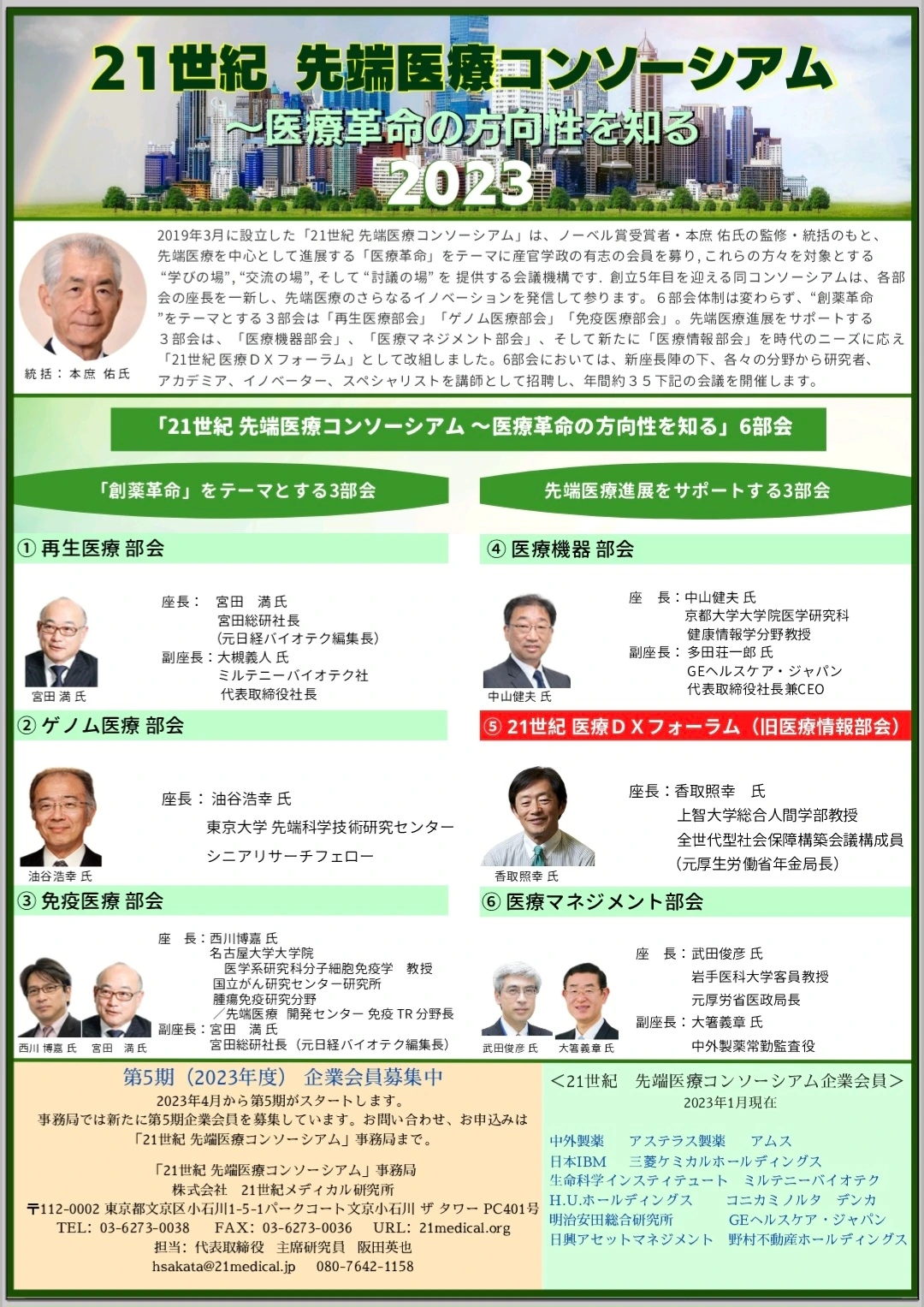21세기 의료포럼: 2009년 1월에 일본의 의료문제 해결을 목표로 하는 제언으로 시작한 21세기 의료포럼은, 2024년 1월에 창립 15주년을 맞이했다. 21세기 의료포럼은, 면역요법의 연구개발에 의해 새로운 암 치료의 방법을 확립한 공적으로 2018년 노벨생리의학상을 수상한 교토대학 고등연구원이자 특별교수인 혼조 타스쿠(本庶佑) 씨가 대표 총괄을 맡는 조직이다.