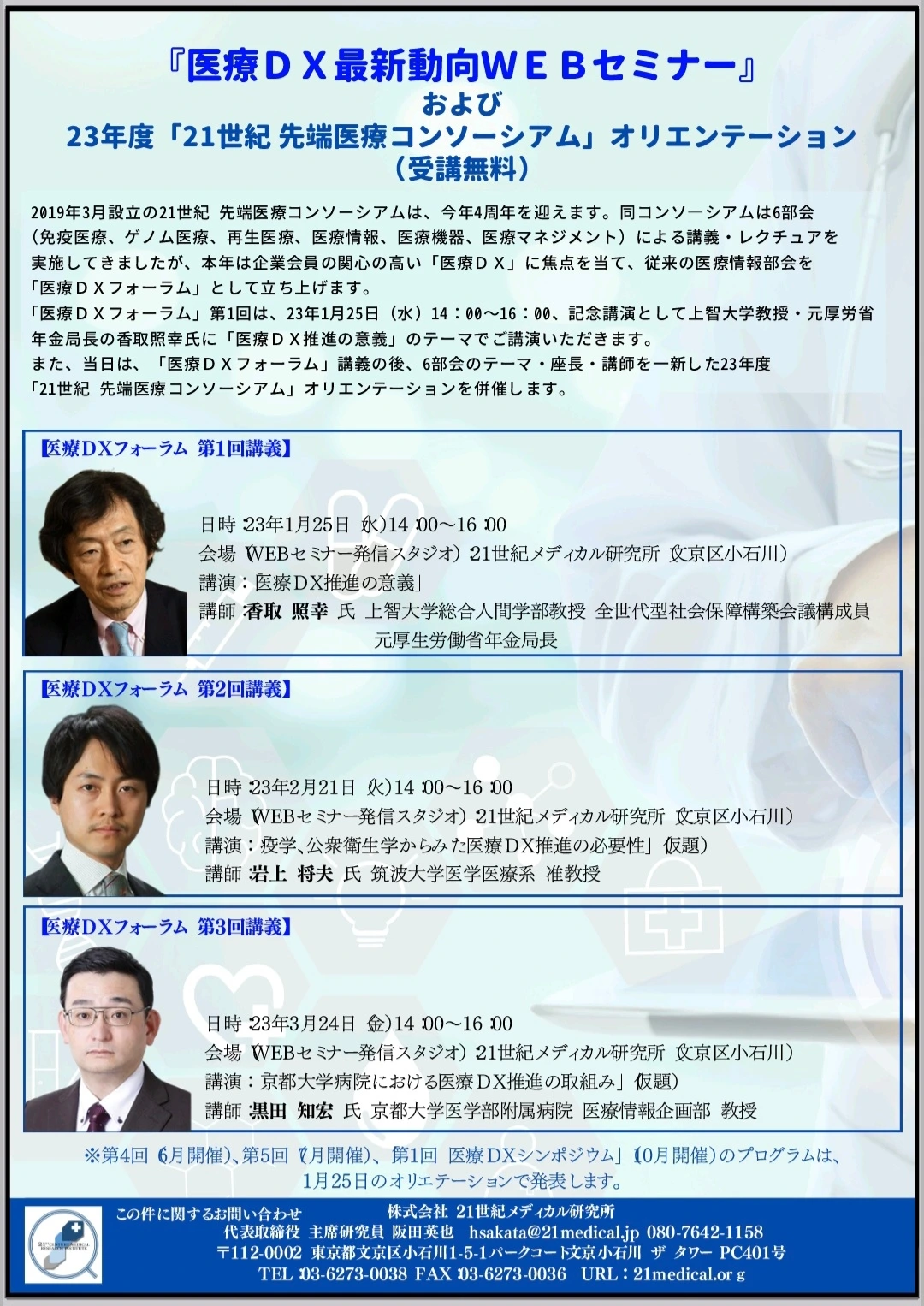 (8) 2023년 1월 25일, 「21세기 첨단의료 컨소시엄」 오리엔테이션과 기념강연 안내: 「의료 DX 추진의 의의」를 주제로 가토리 테루유키(香取照行) 씨가 강사로 발표하였다. *DX: Digital Transformation(디지털 전환)의 약어.