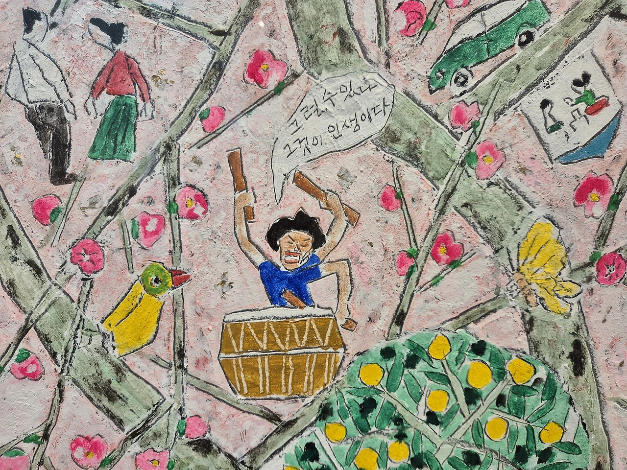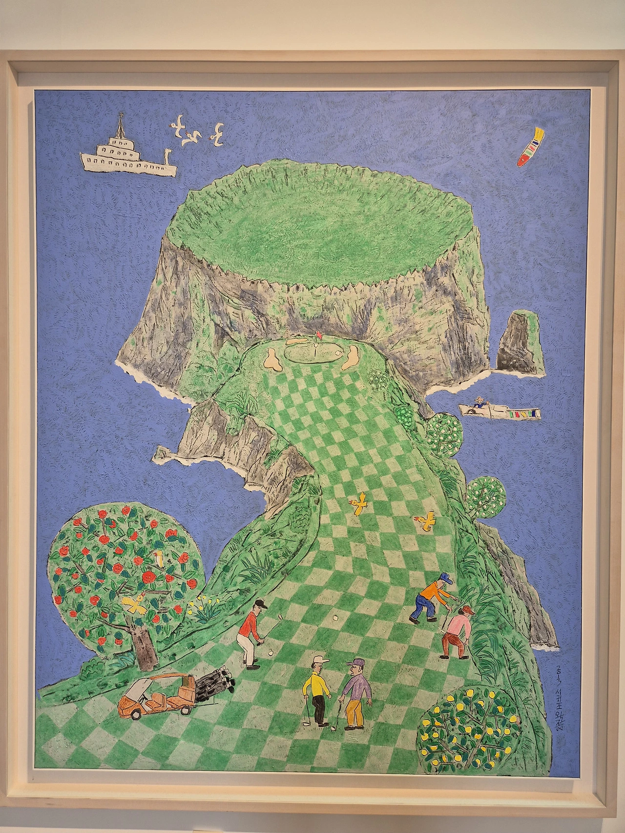 이왈종 화백의 작품세계는 서양화의 기법과 한국적 정서를 결합한 독특한 스타일로 잘 알려져 있는데, 화려한 색채와 간결한 선을 통해 제주도의 풍경과 사람들의 생활을 따뜻하게 그려내고 있다. 그가 제주에 정착한 후, 그곳의 자연과 문화를 작품에 담아내기 시작했다고 한다. 작품에는 제주도의 바다, 오름, 돌담, 마을 사람들의 소박한 일상생활, 본인의 취미인 골프나 요가 그림도 있다.