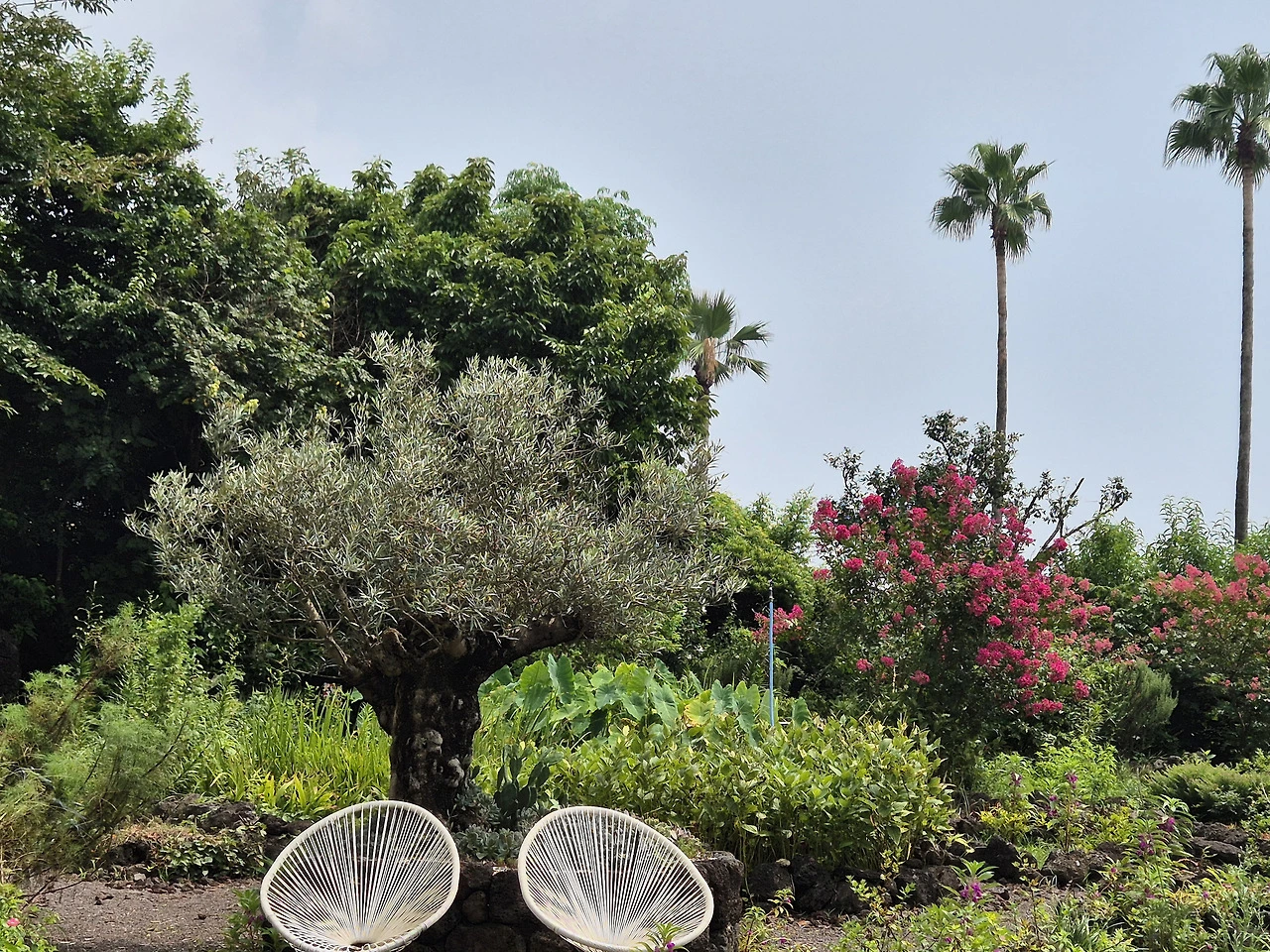 여기서는 제주의 자연과 시간이 빚어낸 다양한 현무암을 활용한 자연석 정원과, 엄청난 수국을 감상할 수 있다. 6월 수국을 지나 지금은 8월의 유럽수국 시기로, 흰색이나 아이보리 색의 단단해 보이는 꽃에 절로 와우~ 하는 함성이 터져 나온다.