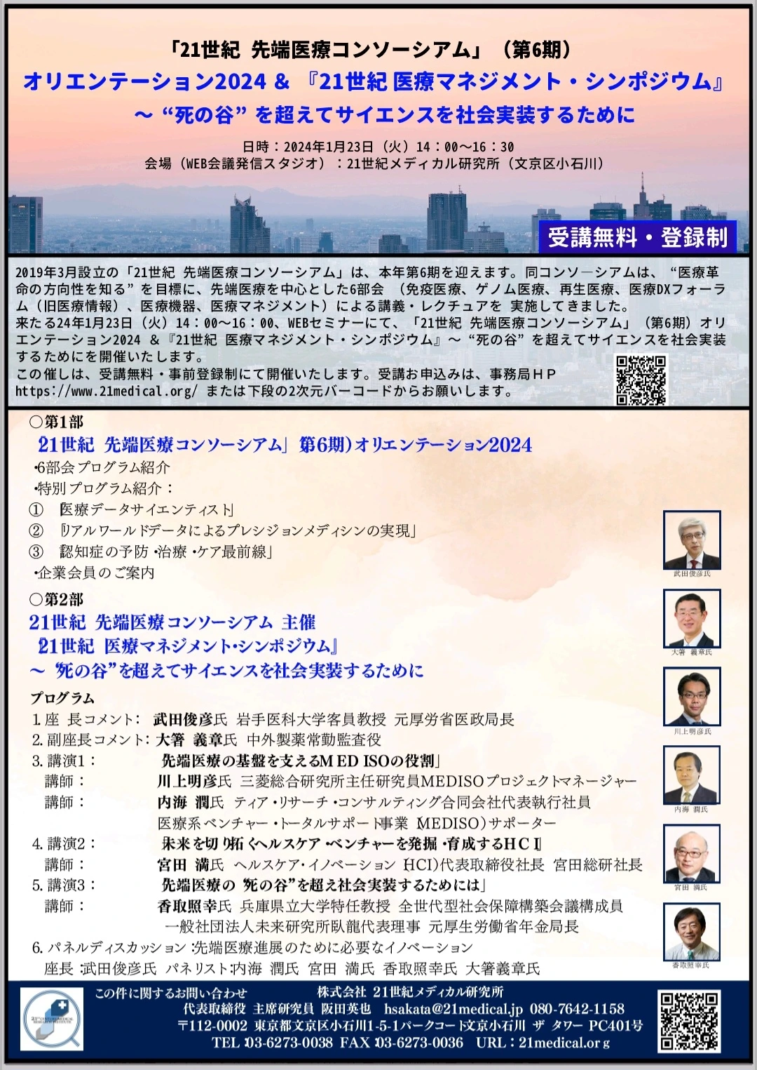 2019년 3월에 설립된 '21세기 첨단의료 컨소시엄'은 이제 6기를 맞이하였다. 동 컨소시엄은, ‘의료혁명의 방향성을 알자'를 목표로, 첨단의료를 중심으로 한 6부회(면역의료, 게놈의료, 재생의료, 의료 DX 포럼, 의료기기, 의료매니지먼트) 강연을 실시해 왔다.