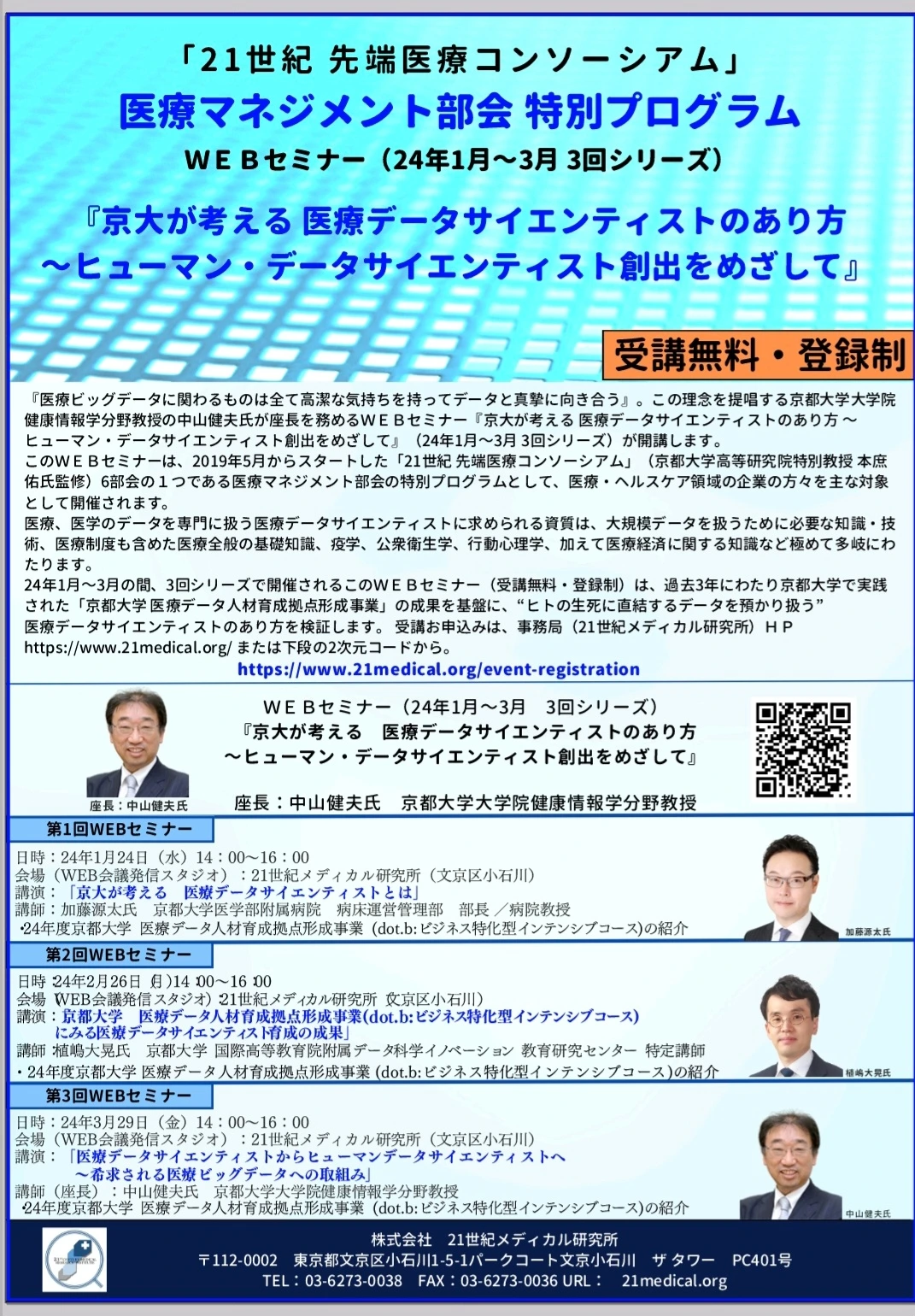(48) 2024년 1월 17일 세미나인 '21세기 첨단의료 컨소시엄' 21세기 의료 DX 포럼 제8회에서 '퍼블릭 헬스, 건강정보학에서 본 의료 DX’의 타이틀로 나카야마 타케오(교토대학 대학원 의학연구과 건강정보학분야 교수, 일본의료연구개발기구(AMED)의 '예방건강 만들기 사회구현을 향한 연구개발기반 정비사업' 프로그램 슈퍼바이저)가 강연하였다.