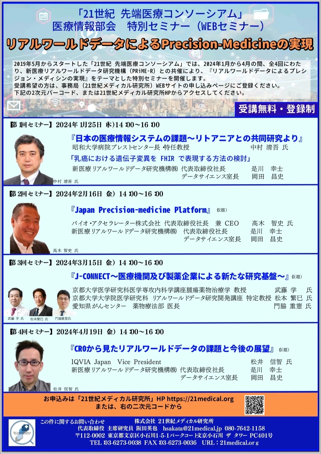 2019년 5월부터 스타트한 「21세기 첨단의료 컨소시엄」에서는, 신의료 리얼월드데이터 연구기구(PRiME-R)와의 공동개최에 의해, 「리얼월드데이터에 의한 프리시젼 메디신의 실현」을 테마로 한 의료정보부회 특별세미나를 2024년 1월부터 4월까지 4회에 걸쳐 개최하였다. *PRiME-R: Prime Research Institute for Medical RWD.