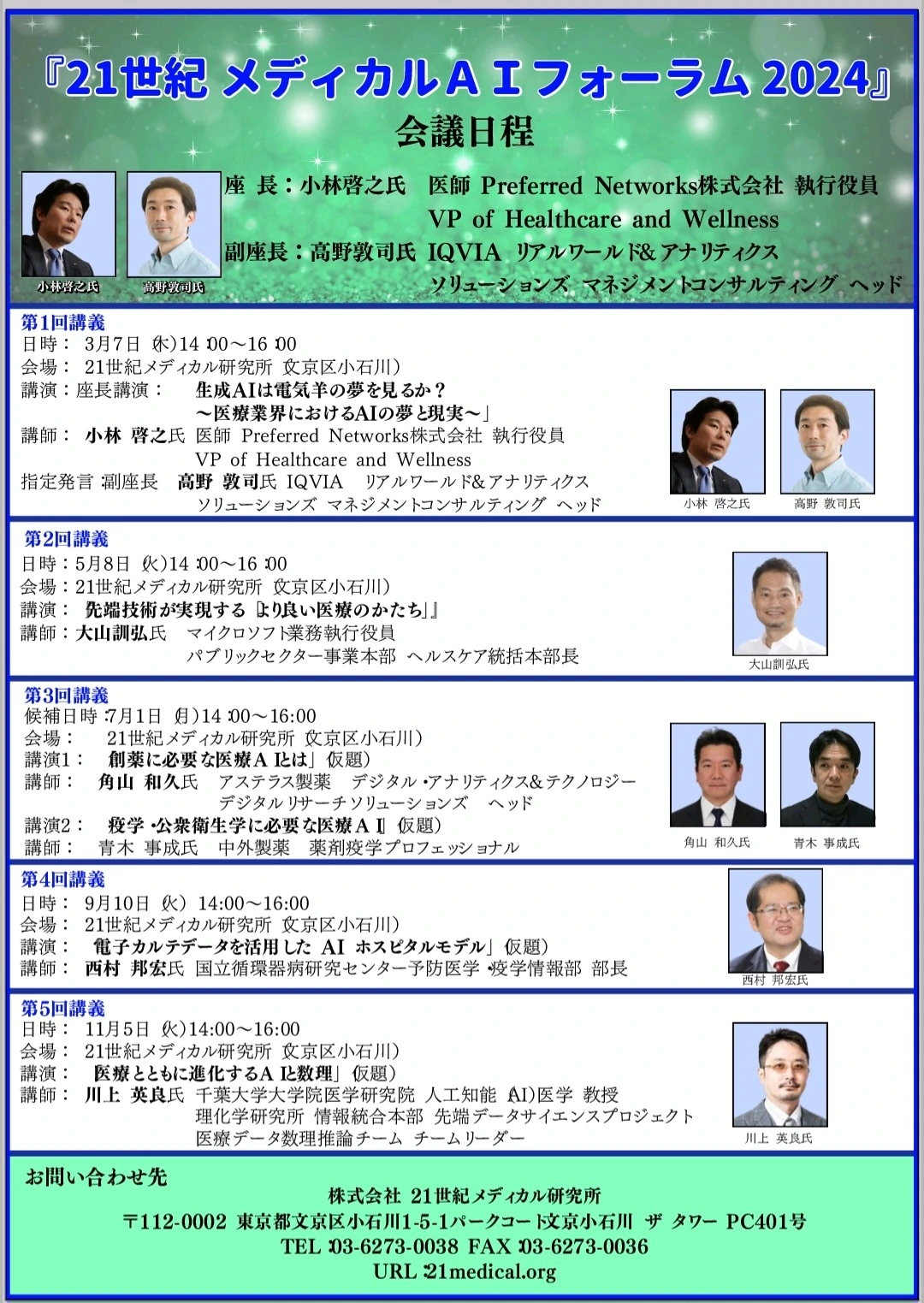 21세기 메디컬 연구소 사무국에서는 최근 생성된 AI의 붐이 도래하고 있는 가운데, 많은 전문가의 요구에 부응하여 「21세기 메디컬 AI포럼 2024」를 시작하였다. AI에 관련된 첨단기업, 제약회사, 의사, 아카데미아(학계)의 다양한 관점에서 의료 AI에 대한 강연을 듣는 전체 5회 시리즈로 전달할 예정이다.